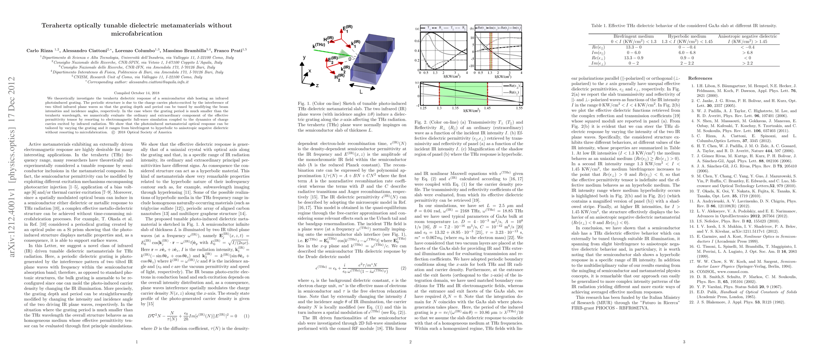 We theoretically investigate the terahertz dielectric response of a semiconductor slab hosting an infrared photoinduced grating. The periodic structure is due to the charge carries photo-excited by the interference of two tilted infrared plane waves so that the grating depth and period can be tuned by modifying the beam intensities and incidence angles, respectively. In the case where the grating period is much smaller than the terahertz wavelength, we numerically evaluate the ordinary and extraordinary component of the effective permittivity tensor by resorting to electromagnetic full-wave simulation coupled to the dynamics of charge carries excited by infrared radiation. We show that the photoinduced metamaterial optical response can be tailored by varying the grating and it ranges from birefringent to hyperbolic to anisotropic negative dielectric without resorting to microfabrication.