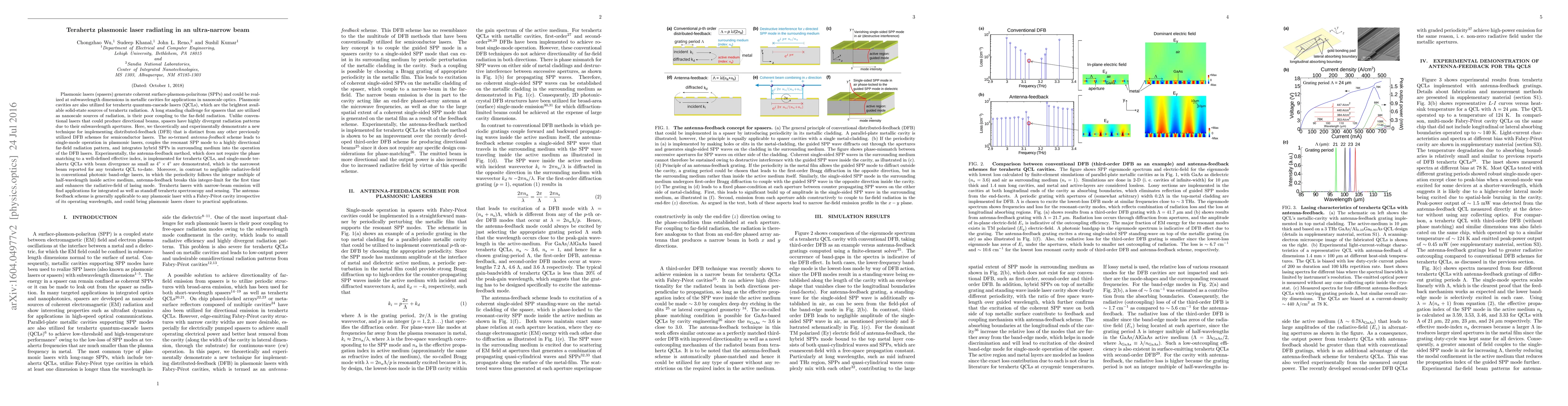 This paper demonstrates a novel antenna-feedback scheme for plasmonic lasers, significantly improving their coupling to far-field radiation and achieving highly directional, ultra-narrow beams for terahertz quantum-cascade lasers, thus enhancing their potential for practical applications.