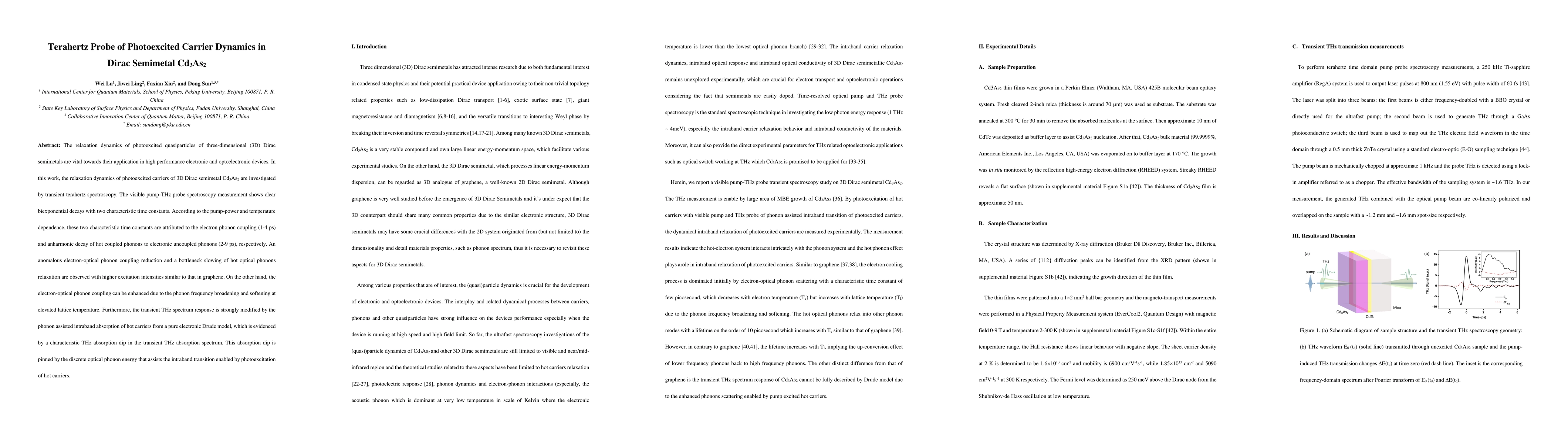 This study investigates the relaxation dynamics of photoexcited carriers in the 3D Dirac semimetal Cd3As2 using transient terahertz spectroscopy, revealing biexponential decay attributed to electron-phonon coupling and phonon relaxation. The research highlights anomalous behavior under high excitation and temperature conditions, including phonon-assisted intraband absorption evidenced by a distinct THz absorption dip.