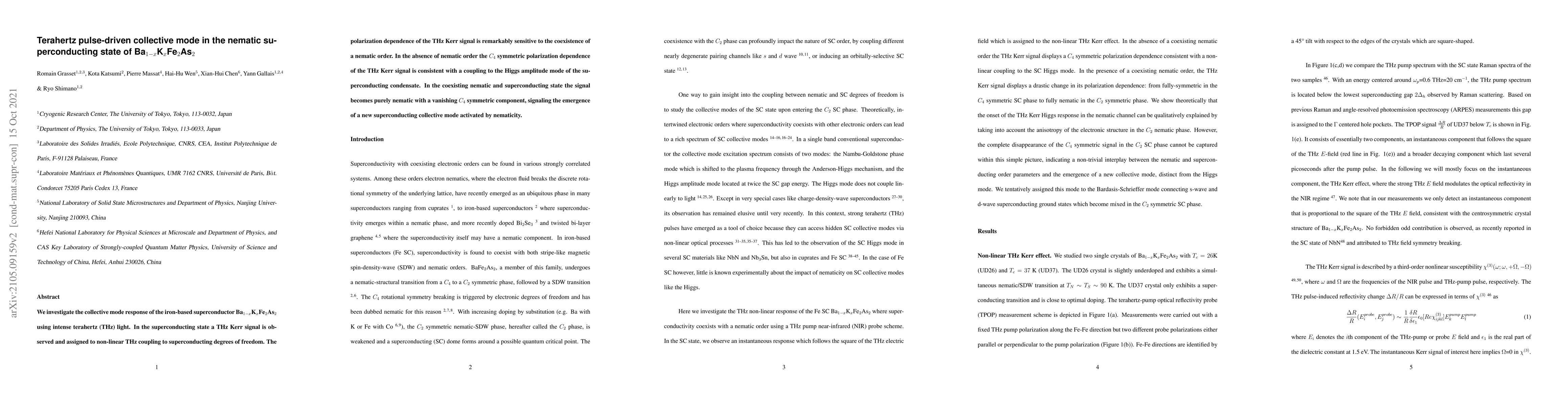 This paper explores the interaction of terahertz pulses with Ba$_{1-x}$K$_x$Fe$_2$As$_2$, revealing a THz Kerr signal linked to superconducting degrees of freedom. The study finds that nematic order significantly alters the polarization dependence of the THz Kerr signal, indicating the emergence of a new collective mode in the superconducting state driven by nematicity.