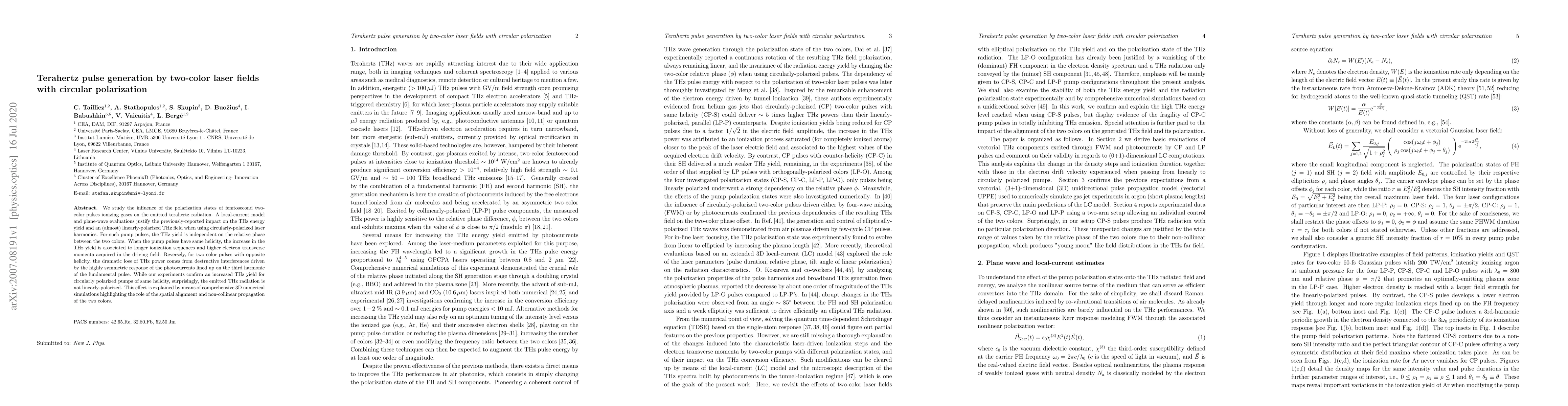 This paper investigates the generation of terahertz radiation using two-color femtosecond laser pulses with circular polarization, finding that the THz yield is maximized when both pulses have the same helicity due to longer ionization sequences and higher electron momenta. However, contrary to expectations, the emitted THz radiation is not linearly polarized, a phenomenon explained by 3D simulations emphasizing the spatial alignment and non-collinear propagation of the two colors.