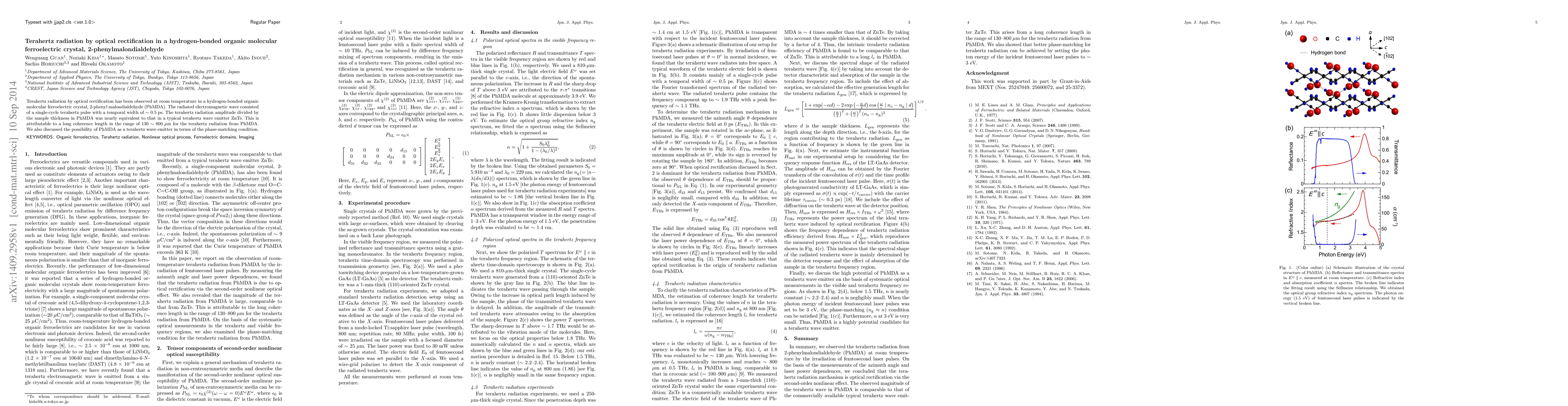 This study reports the generation of terahertz radiation via optical rectification in the hydrogen-bonded organic ferroelectric crystal 2-phenylmalondialdehyde (PhMDA) at room temperature, producing a single-cycle pulse with a temporal width of approximately 0.5 ps. The terahertz radiation's amplitude per unit thickness in PhMDA is comparable to that of ZnTe, indicating a long coherence length and potential for use as a terahertz wave emitter.