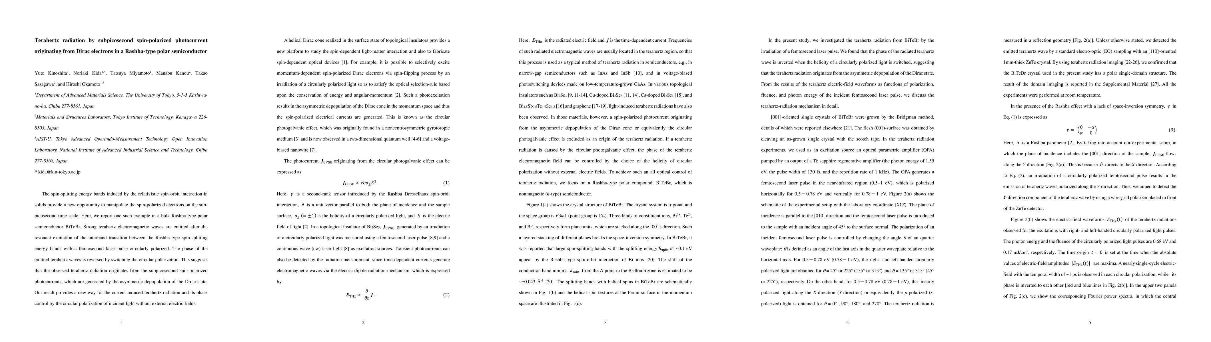 This paper reports the generation of strong terahertz radiation from subpicosecond spin-polarized photocurrents in a Rashba-type polar semiconductor, BiTeBr, induced by resonant interband transitions via circularly polarized femtosecond laser pulses. The emitted terahertz waves' phase reverses with the polarization of the incident light, indicating control over terahertz radiation via the spin-polarized current without external electric fields.