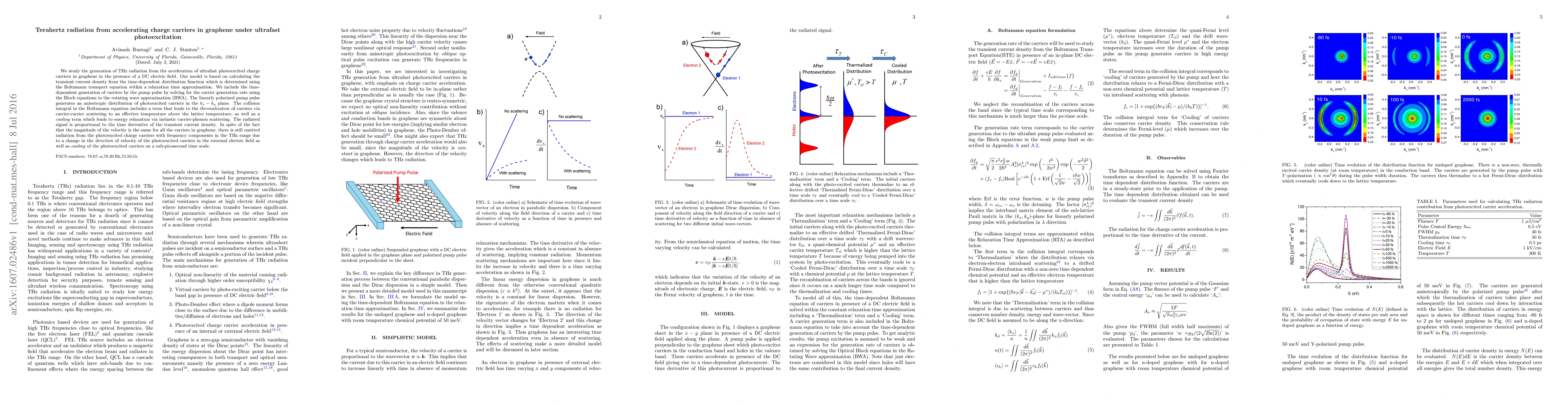 This paper investigates the generation of terahertz radiation from graphene's accelerating charge carriers under ultrafast photoexcitation, revealing that THz emission arises due to changes in the carriers' velocity direction and cooling effects despite uniform velocity magnitude. The study employs the Boltzmann transport equation and Bloch equations to model the transient current density and carrier generation.