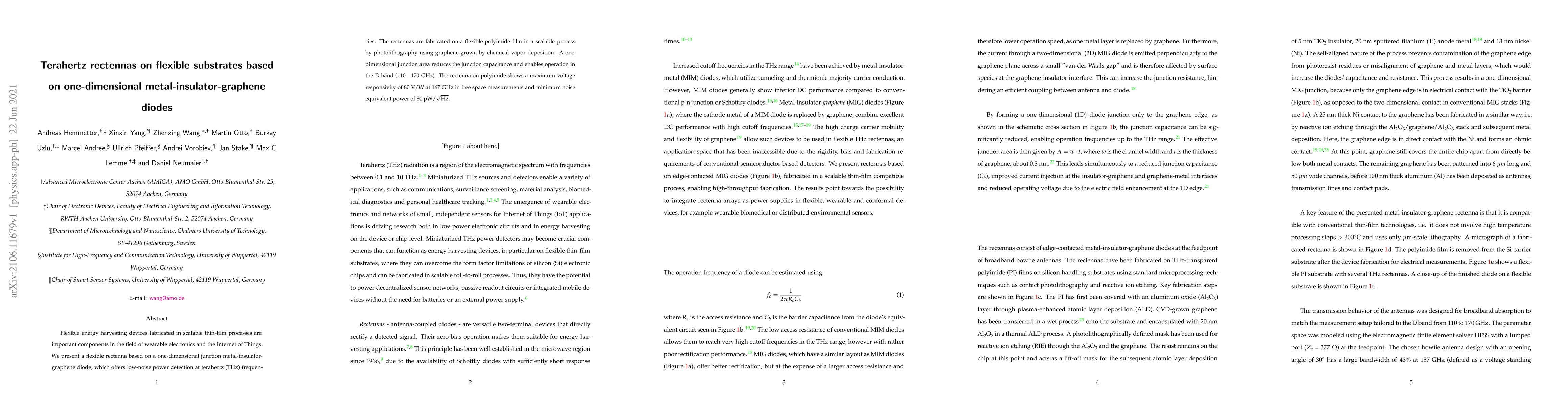 Flexible energy harvesting devices fabricated in scalable thin-film processes are important components in the field of wearable electronics and the Internet of Things. We present a flexible rectenna based on a one-dimensional junction metal-insulator-graphene diode, which offers low-noise power detection at terahertz (THz) frequencies. The rectennas are fabricated on a flexible polyimide film in a scalable process by photolithography using graphene grown by chemical vapor deposition. A one-dimensional junction area reduces the junction capacitance and enables operation in the D-band (110 - 170 GHz). The rectenna on polyimide shows a maximum voltage responsivity of 80 V/W at 167 GHz in free space measurements and minimum noise equivalent power of 80 pW/$\sqrt{\text{Hz}}$.