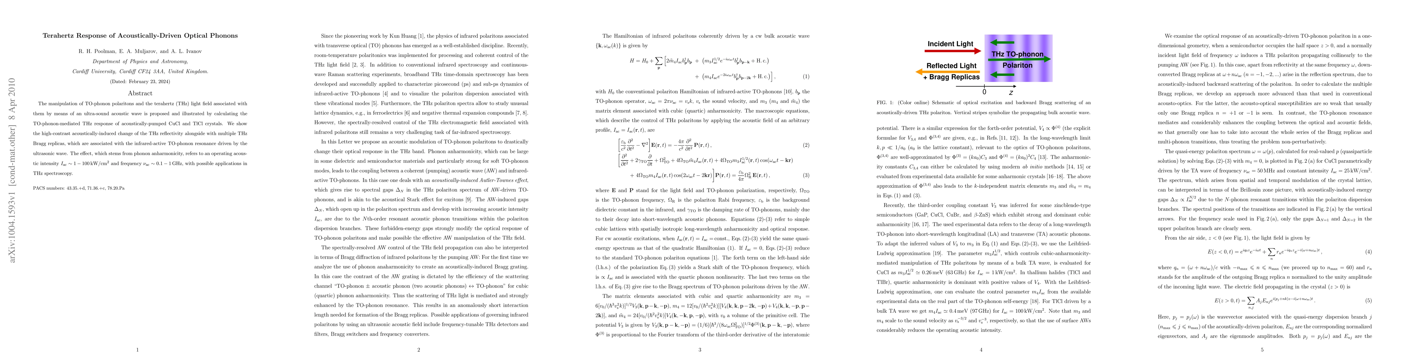 The manipulation of TO-phonon polaritons and the terahertz (THz) light field associated with them by means of an ultra-sound acoustic wave is proposed and illustrated by calculating the TO-phonon-mediated THz response of acoustically-pumped CuCl and TlCl crystals. We show the high-contrast acoustically-induced change of the THz reflectivity alongside with multiple THz Bragg replicas, which are associated with the infrared-active TO-phonon resonance driven by the ultrasonic wave. The effect, which stems from phonon anharmonicity, refers to an operating acoustic intensity I_ac ~ 1-100 kW/cm^2 and frequency nu_ac ~ 0.1 - 1 GHz, with possible applications in THz spectroscopy.
