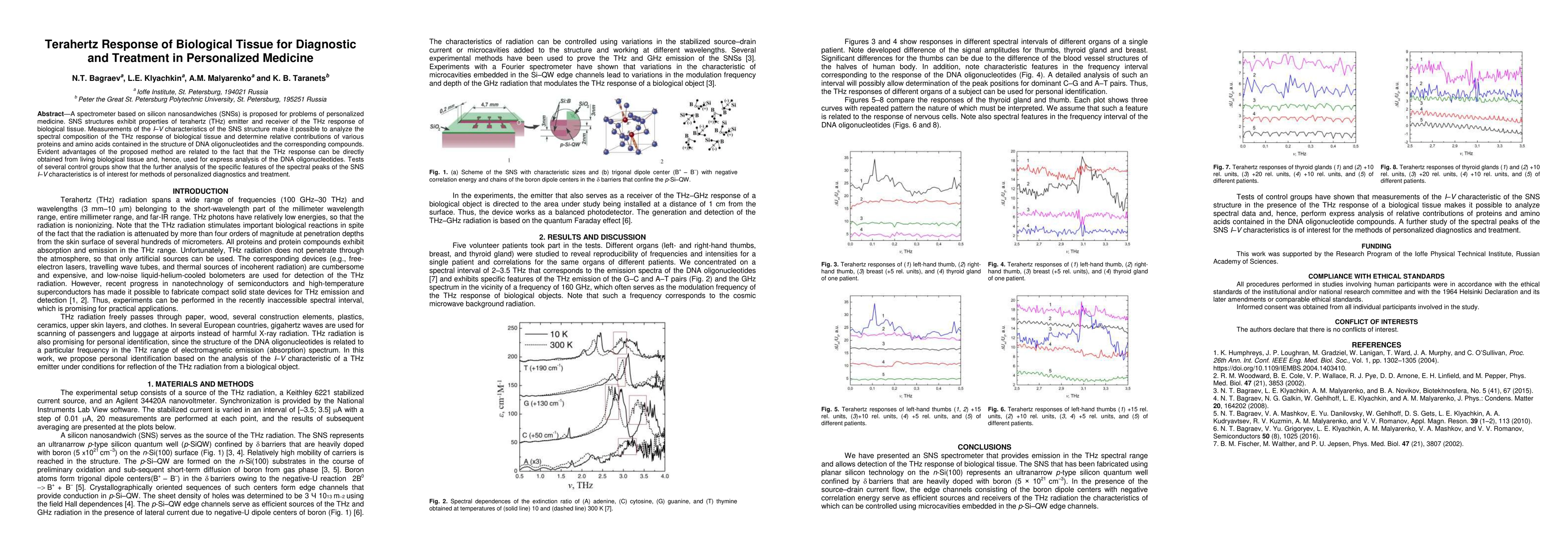 A spectrometer based on silicon nanosandwiches (SNS) is proposed for problems of personalized medicine. SNS structures exhibit properties of terahertz (THz) emitter and receiver of the THz response of biological tissue. Measurements of the current-voltage curves of the SNS structure make it possible to analyze the spectral composition of the THz response of biological tissue and determine relative contributions of various proteins and amino acids contained in the structure of DNA oligonucleotides and the corresponding compounds. Evident advantages of the proposed method are related to the fact that the THz response can be directly obtained from living biological tissue and, hence, used for express analysis of the DNA oligonucleotides. Tests of several control groups show that the further analysis of the specific features of the spectral peaks of the SNS current-voltage curves is of interest for methods of personalized diagnostics and treatment.