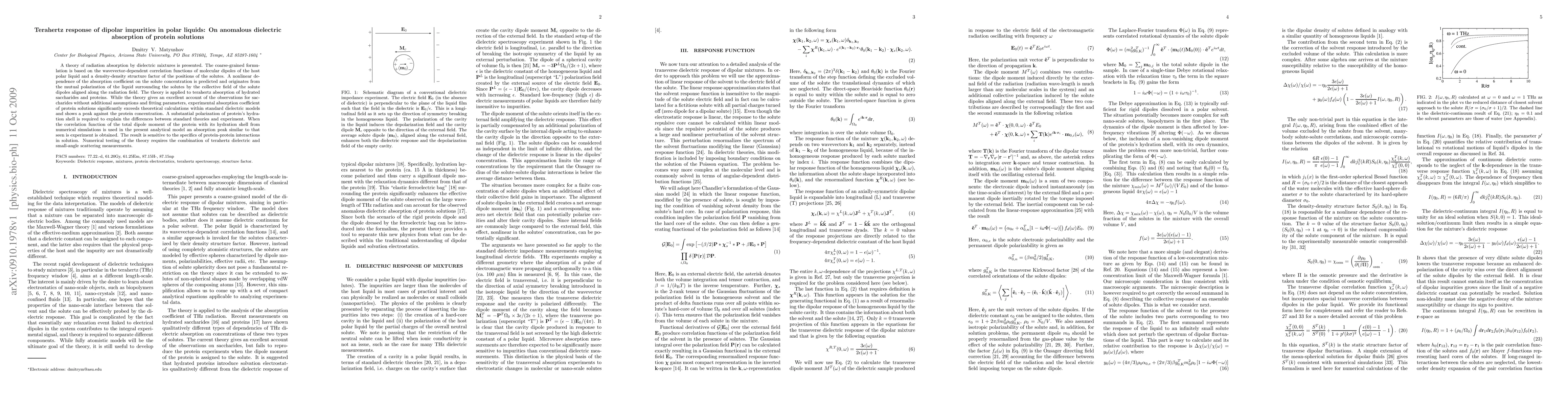 A theory of radiation absorption by dielectric mixtures is presented. The coarse-grained formulation is based on the wavevector-dependent correlation functions of molecular dipoles of the host polar liquid and a density-density structure factor of the positions of the solutes. A nonlinear dependence of the absorption coefficient on the solute concentration is predicted and originates from the mutual polarization of the liquid surrounding the solutes by the collective field of the solute dipoles aligned along the radiation field. The theory is applied to terahertz absorption of hydrated saccharides and proteins. While the theory gives an excellent account of the observations for saccharides without additional assumptions and fitting parameters, experimental absorption coefficient of protein solutions significantly exceeds theoretical calculations within standard dielectric models and shows a peak against the protein concentration. A substantial polarization of protein's hydration shell is required to explain the differences between standard theories and experiment. When the correlation function of the total dipole moment of the protein with its hydration shell from numerical simulations is used in the present analytical model an absorption peak similar to that seen is experiment is obtained. The result is sensitive to the specifics of protein-protein interactions in solution. Numerical testing of the theory requires the combination of terahertz dielectric and small-angle scattering measurements.