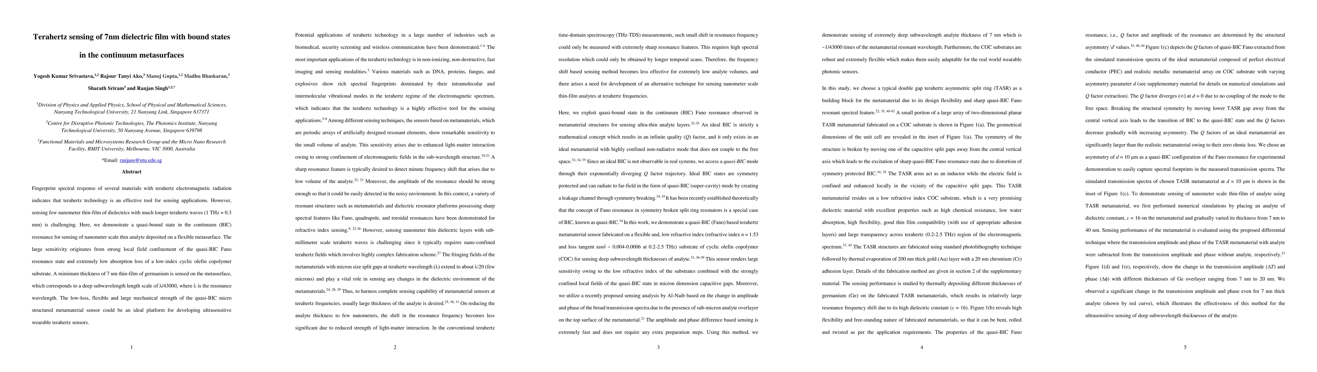 Researchers developed a terahertz sensor that can detect 7nm-thick dielectric films using metasurfaces with quasi-bound state in the continuum resonance, offering ultrasensitive sensing capabilities for wearable applications.