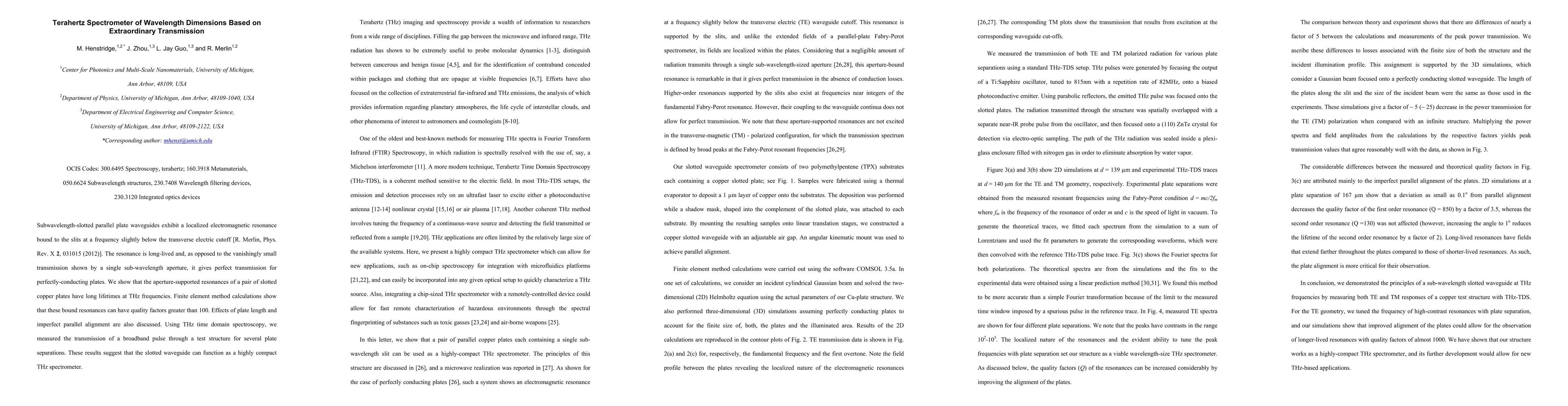 This paper presents a terahertz spectrometer based on extraordinary transmission through subwavelength-slotted parallel plate waveguides, demonstrating long-lived resonances with quality factors greater than 100. The study uses THz time domain spectroscopy to show that these waveguides can function as compact spectrometers.