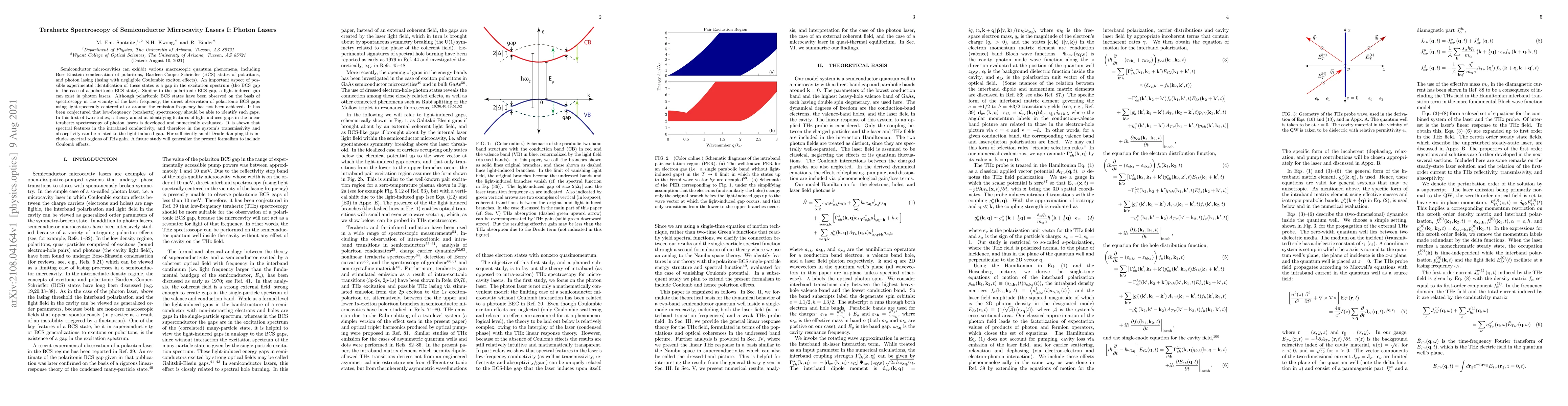 This paper develops a theoretical framework for identifying light-induced gaps in photon lasers using terahertz spectroscopy, demonstrating that spectral features in the intraband conductivity can reveal these gaps, potentially including regions of THz gain. A subsequent study will extend this approach to account for Coulomb effects.
