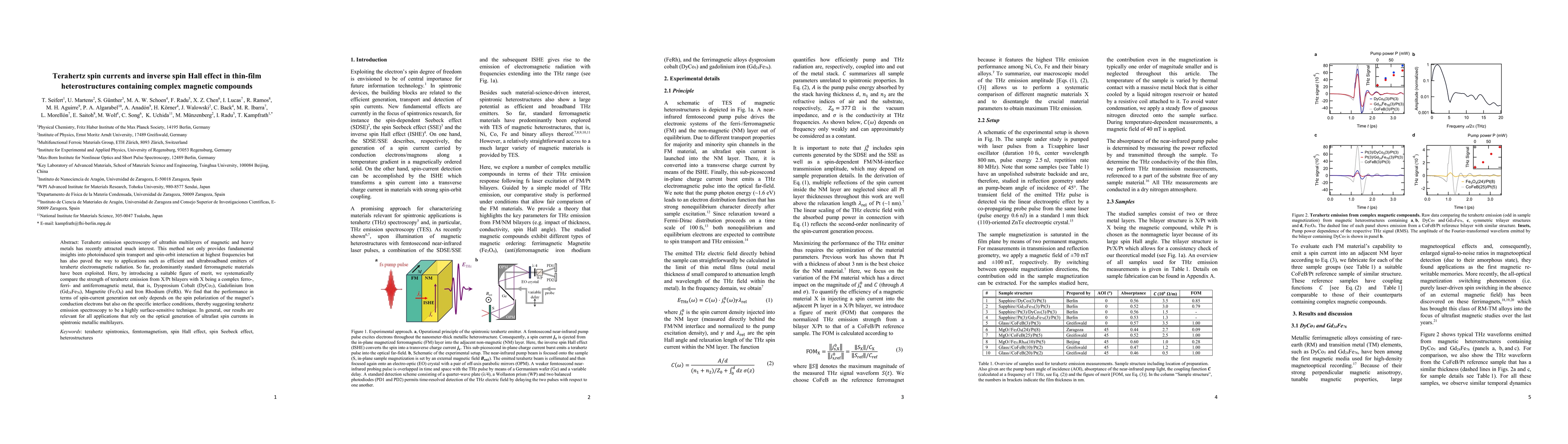 This study investigates terahertz emission from thin-film heterostructures using complex magnetic compounds, revealing that spin-current generation efficiency depends on both the magnet's spin polarization and interface conditions. The findings highlight the surface-sensitivity of terahertz emission spectroscopy and its relevance to spintronic applications.
