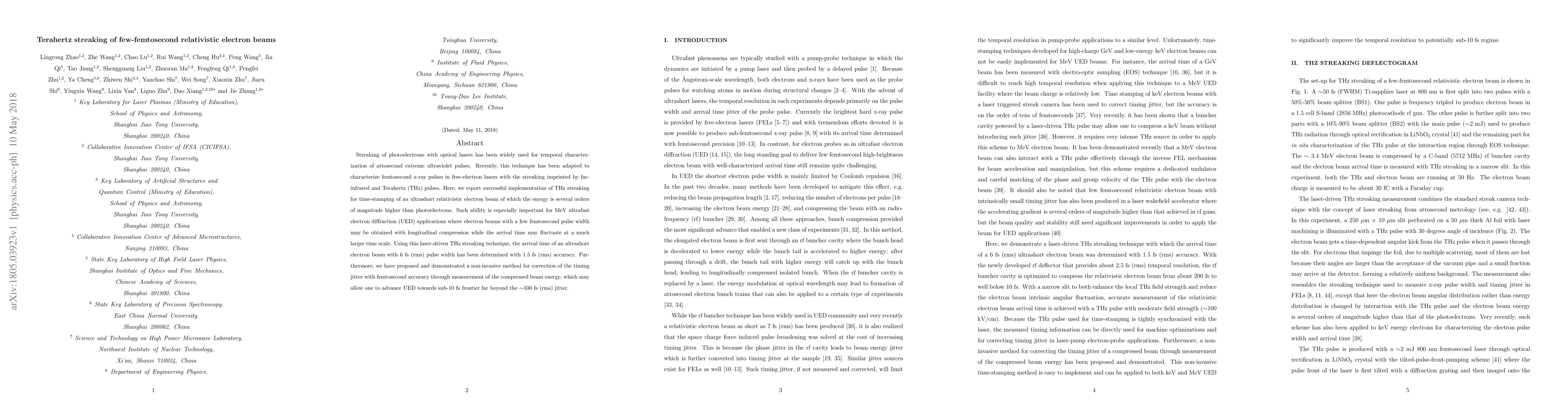 This paper reports the successful use of Terahertz (THz) pulses to streak and accurately time-stamp ultrashort relativistic electron beams, achieving 1.5 fs (rms) accuracy for 6 fs (rms) pulse widths. Additionally, it introduces a non-invasive method for correcting timing jitter with femtosecond precision, potentially advancing MeV ultrafast electron diffraction (UED) towards sub-10 fs resolution.