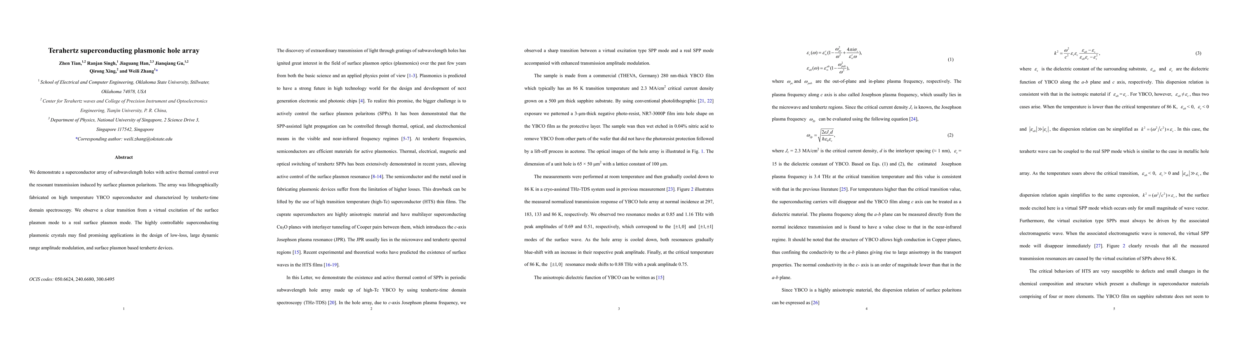 This paper presents a thermally tunable superconducting hole array that controls terahertz resonant transmission via surface plasmon polaritons, demonstrating a transition from virtual to real surface plasmon modes. The potential for low-loss, high dynamic range modulation and advanced terahertz devices is highlighted.