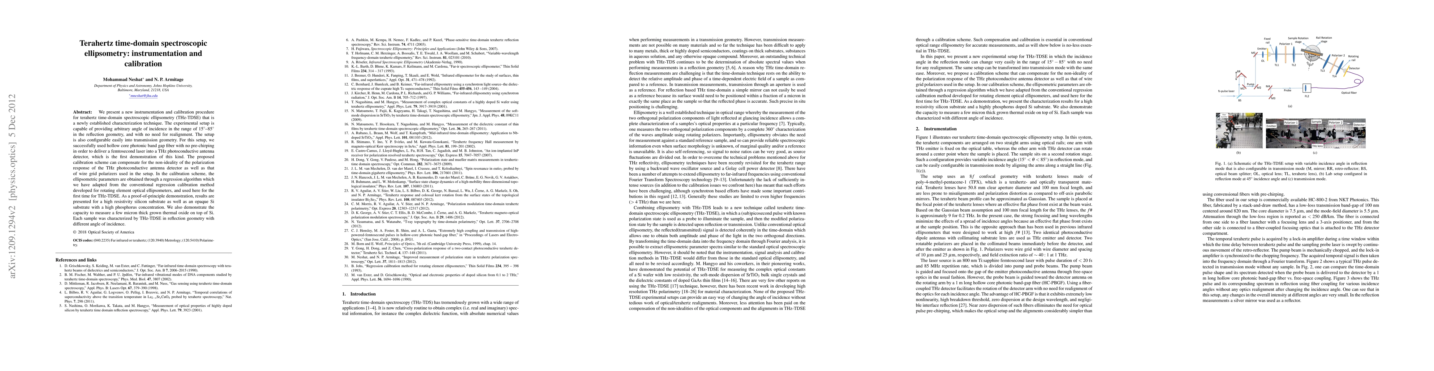 The research presents a new instrumentation and calibration procedure for Terahertz time-domain spectroscopic ellipsometry (THz-TDSE), featuring an experimental setup that provides an adjustable angle of incidence (15°--85°) in reflection geometry with no realignment needed. The setup can also be easily configured for transmission geometry, using hollow core photonic band gap fiber without pre-chirping to deliver a femtosecond laser to a THz photoconductive antenna detector.