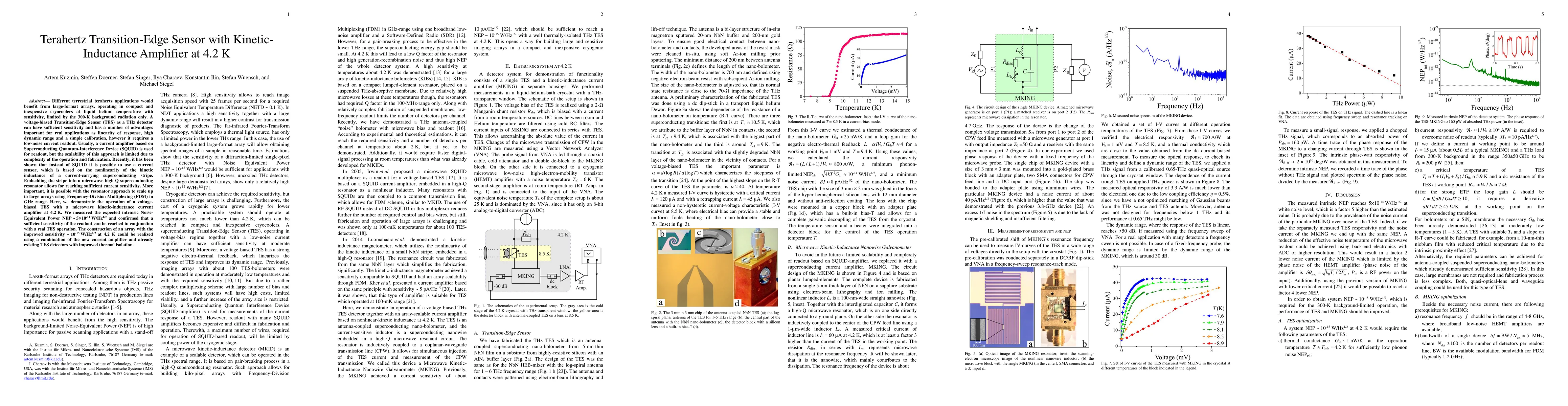 Different terrestrial terahertz applications would benefit from large-format arrays, operating in compact and inexpensive cryocoolers at liquid helium temperature with sensitivity, limited by the 300-K background radiation only. A voltage-biased Transition-Edge Sensor (TES) as a THz detector can have sufficient sensitivity and has a number of advantages important for real applications as linearity of response, high dynamic range and a simple calibration, however it requires a low-noise current readout. Usually, a current amplifier based on Superconducting Quantum-Interference Device (SQUID) is used for readout, but the scalability of this approach is limited due to complexity of the operation and fabrication. Recently, it has been shown that instead of SQUID it is possible to use a current sensor, which is based on the nonlinearity of the kinetic inductance of a current-carrying superconducting stripe. Embedding the stripe into a microwave high-Q superconducting resonator allows for reaching sufficient current sensitivity. More important, it is possible with the resonator approach to scale up to large arrays using Frequency-Division Multiplexing (FDM) in GHz range. Here, we demonstrate the operation of a voltage-biased TES with a microwave kinetic-inductance current amplifier at 4.2 K. We measured the expected intrinsic Noise-Equivalent Power NEP ~$5\times 10^{-14} \; \rm W/Hz^{1/2}$ and confirmed that a sufficient sensitivity of the readout can be reached in conjunction with a real TES operation. The construction of an array with the improved sensitivity ~ $10^{-15}\; \rm W/Hz^{1/2}$ at 4.2 K could be realized using a combination of the new current amplifier and already existing TES detectors with improved thermal isolation.
