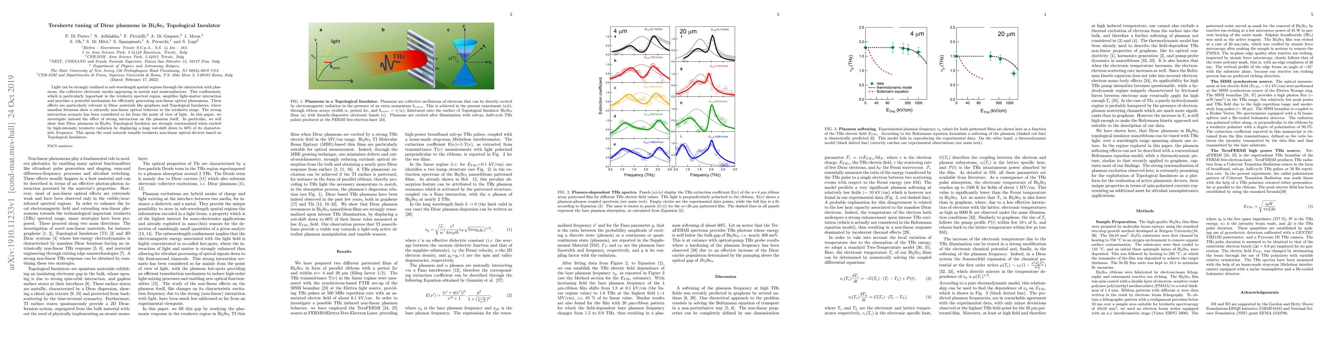 Light can be strongly confined in sub-wavelength spatial regions through the interaction with plasmons, the collective electronic modes appearing in metals and semiconductors. This confinement, which is particularly important in the terahertz spectral region, amplifies light-matter interaction and provides a powerful mechanism for efficiently generating non-linear optical phenomena. These effects are particularly relevant in Dirac materials like graphene and Topological Insulators, where massless fermions show a naturally non-linear optical behavior in the terahertz range. The strong interaction scenario has been considered so far from the point of view of light. In this paper, we investigate instead the effect of strong interaction on the plasmon itself. In particular, we will show that Dirac plasmons in Bi$_2$Se$_3$ Topological Insulator are strongly renormalized when excited by high-intensity terahertz radiation by displaying a huge red-shift down to 60% of its characteristic frequency. This opens the road towards tunable terahertz non-linear optical devices based on Topological Insulators.