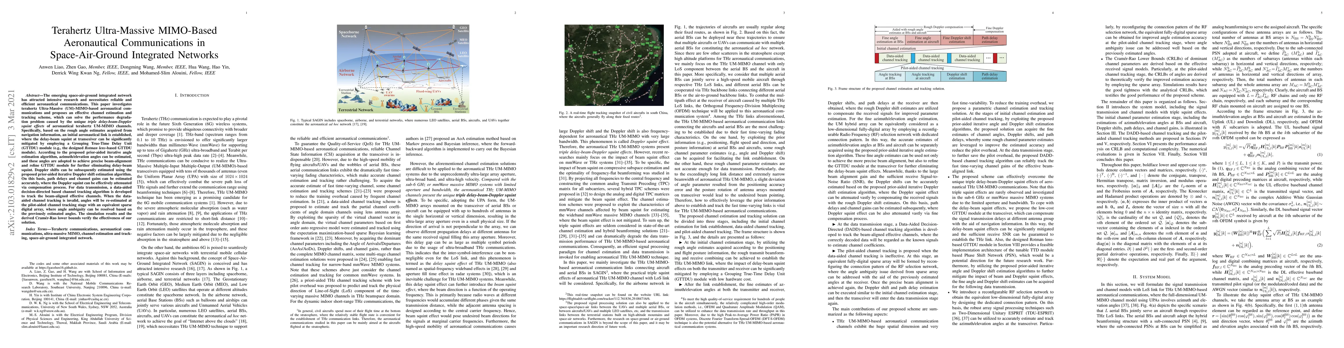 The emerging space-air-ground integrated network has attracted intensive research and necessitates reliable and efficient aeronautical communications. This paper investigates terahertz Ultra-Massive (UM)-MIMO-based aeronautical communications and proposes an effective channel estimation and tracking scheme, which can solve the performance degradation problem caused by the unique {\emph{triple delay-beam-Doppler squint effects}} of aeronautical terahertz UM-MIMO channels. Specifically, based on the rough angle estimates acquired from navigation information, an initial aeronautical link is established, where the delay-beam squint at transceiver can be significantly mitigated by employing a Grouping True-Time Delay Unit (GTTDU) module (e.g., the designed {\emph{Rotman lens}}-based GTTDU module). According to the proposed prior-aided iterative angle estimation algorithm, azimuth/elevation angles can be estimated, and these angles are adopted to achieve precise beam-alignment and refine GTTDU module for further eliminating delay-beam squint. Doppler shifts can be subsequently estimated using the proposed prior-aided iterative Doppler shift estimation algorithm. On this basis, path delays and channel gains can be estimated accurately, where the Doppler squint can be effectively attenuated via compensation process. For data transmission, a data-aided decision-directed based channel tracking algorithm is developed to track the beam-aligned effective channels. When the data-aided channel tracking is invalid, angles will be re-estimated at the pilot-aided channel tracking stage with an equivalent sparse digital array, where angle ambiguity can be resolved based on the previously estimated angles. The simulation results and the derived Cram\'{e}r-Rao lower bounds verify the effectiveness of our solution.