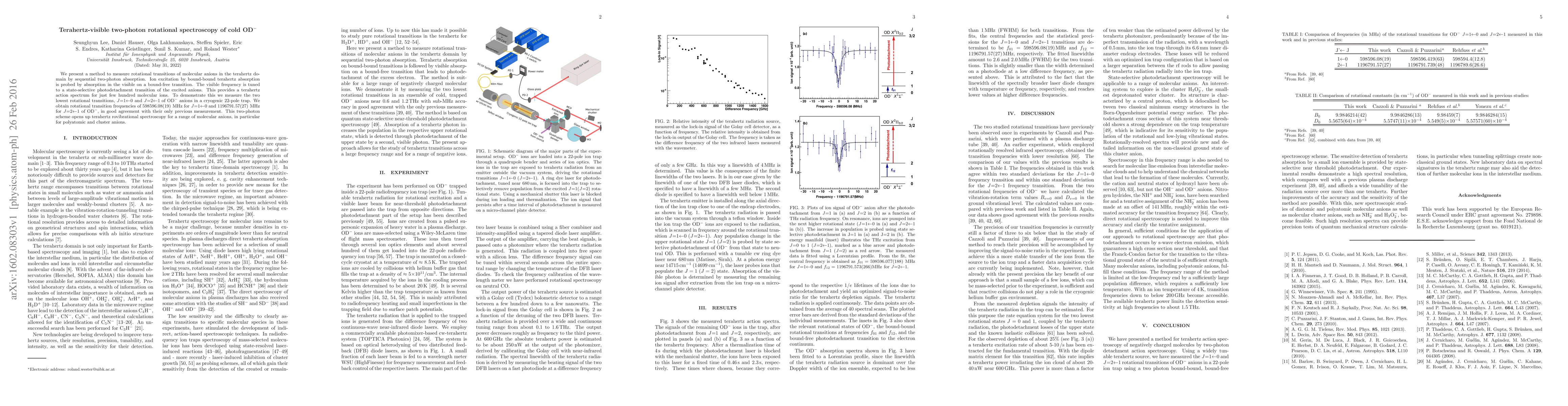 This paper introduces a novel method for measuring rotational transitions in molecular anions using terahertz-visible two-photon spectroscopy, demonstrating it on OD- anions and achieving precise frequencies for their lowest rotational transitions. This technique enables terahertz rovibrational spectroscopy for a variety of molecular anions.