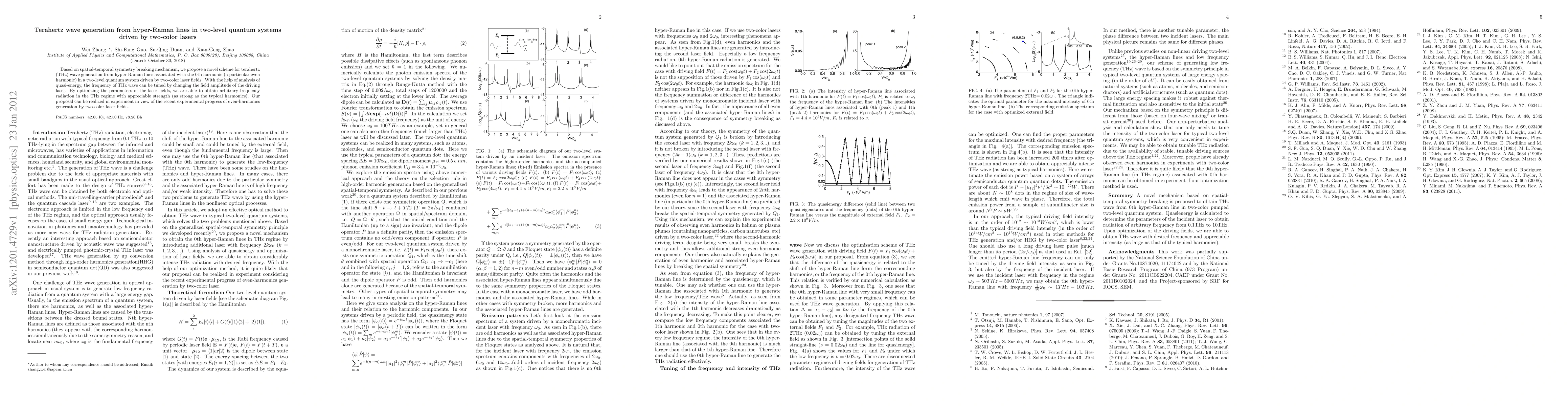 This paper proposes a novel scheme for generating terahertz waves via hyper-Raman lines in two-level quantum systems driven by two-color laser fields, utilizing spatial-temporal symmetry breaking. The frequency of the generated THz wave can be tuned by adjusting the driving laser's field amplitude, enabling the production of arbitrary THz frequencies with significant strength.