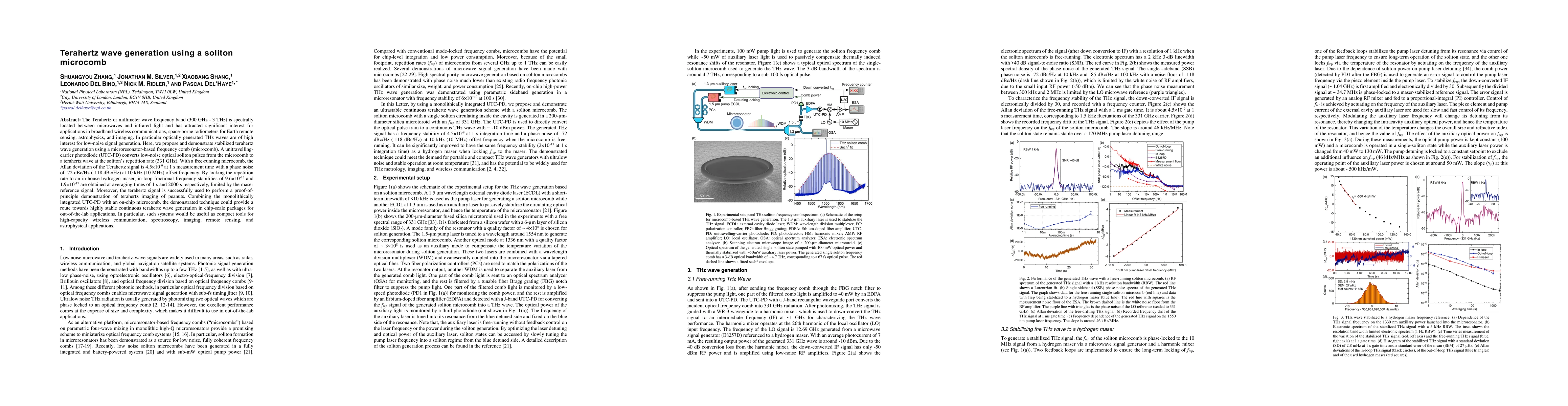 This paper proposes and demonstrates stabilized terahertz wave generation using a microresonator-based frequency comb and a unitravelling-carrier photodiode, achieving high stability and low noise. The technique shows potential for applications in wireless communication, imaging, and remote sensing.