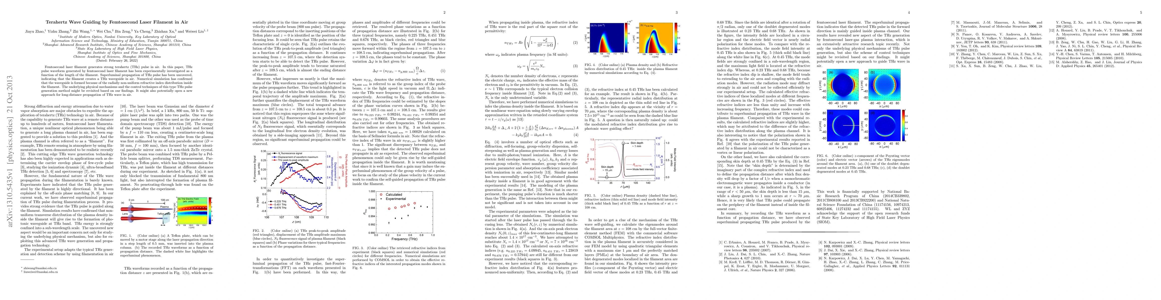 This paper investigates the generation and propagation of terahertz (THz) pulses by femtosecond laser filaments in air, revealing superluminal THz pulse propagation indicative of waveguide formation. Numerical simulations attribute this to a radially non-uniform refractive index, suggesting potential for new long-distance THz wave propagation techniques.