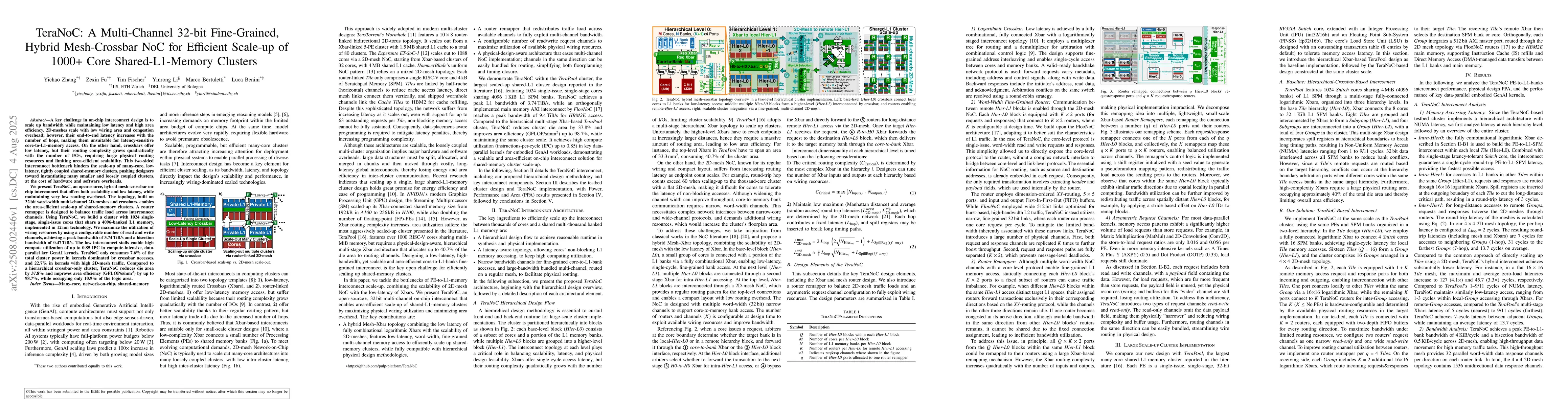 The research introduces TeraNoC, a hybrid mesh-crossbar on-chip interconnect that efficiently scales up to 1024 cores sharing a large L1 memory. It balances traffic load and offers low latency, reducing die area by 37.8% and improving area efficiency by up to 98.7% compared to a crossbar-only design.