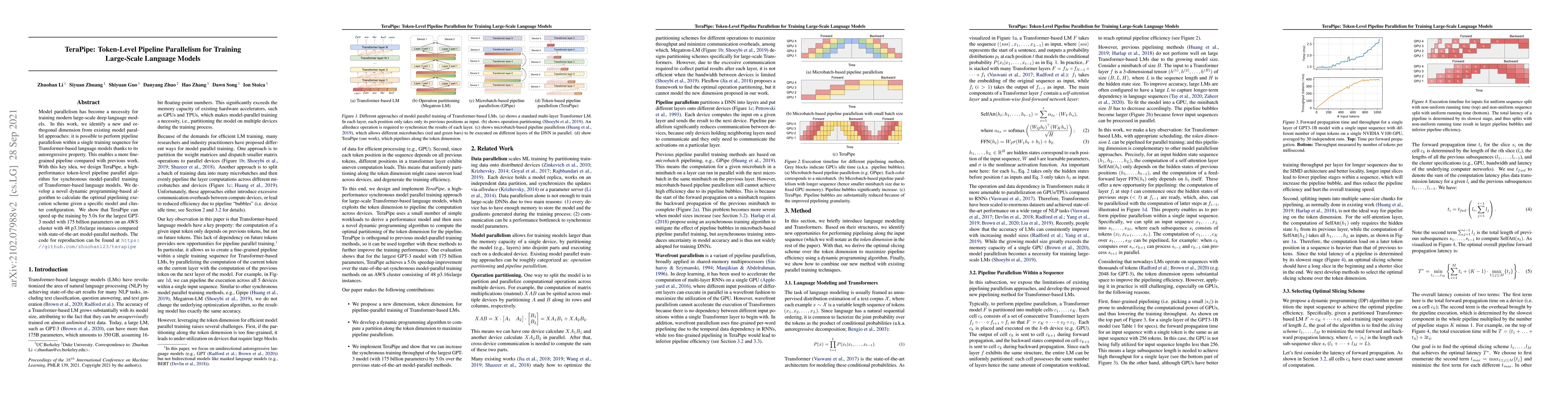 TeraPipe introduces a novel token-level pipeline parallelism technique for training large-scale Transformer-based language models, achieving up to 5x speedup compared to state-of-the-art model-parallel methods. The method leverages dynamic programming to optimize execution schemes for efficient synchronous training.