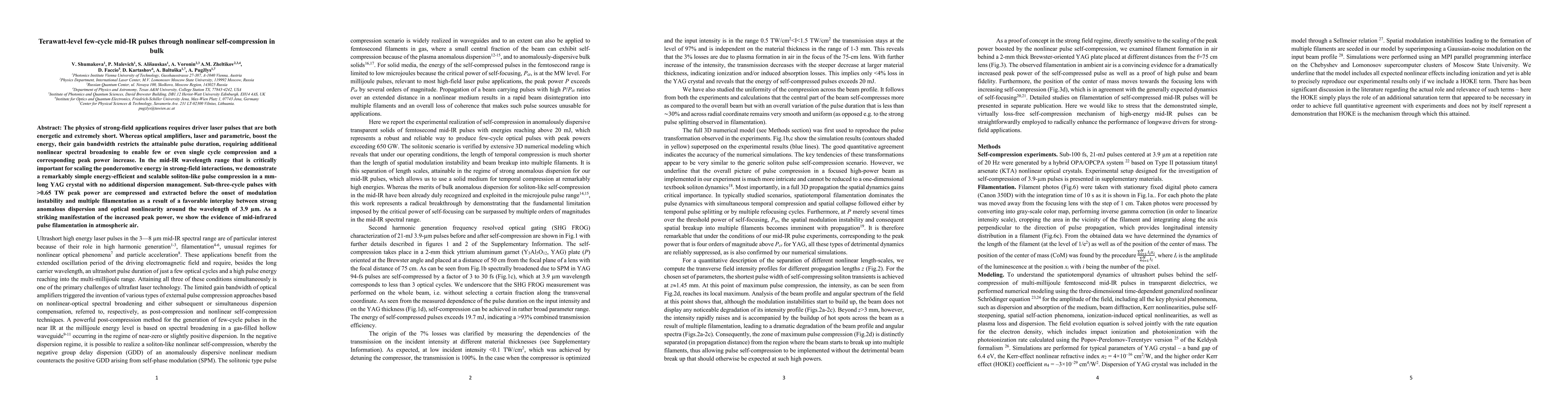 This paper demonstrates a method for generating terawatt-level, few-cycle mid-IR pulses through nonlinear self-compression in a bulk YAG crystal, achieving sub-three-cycle pulses with >0.65 TW peak power without additional dispersion management, and showing evidence of mid-infrared pulse filamentation in air.
