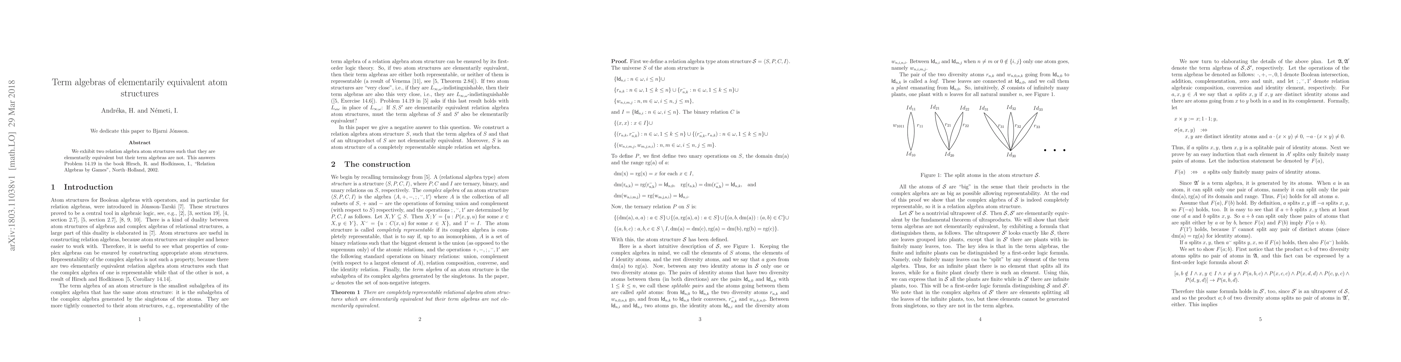 We exhibit two relation algebra atom structures such that they are elementarily equivalent but their term algebras are not. This answers Problem 14.19 in the book Hirsch, R. and Hodkinson, I., "Relation Algebras by Games", North-Holland, 2002.