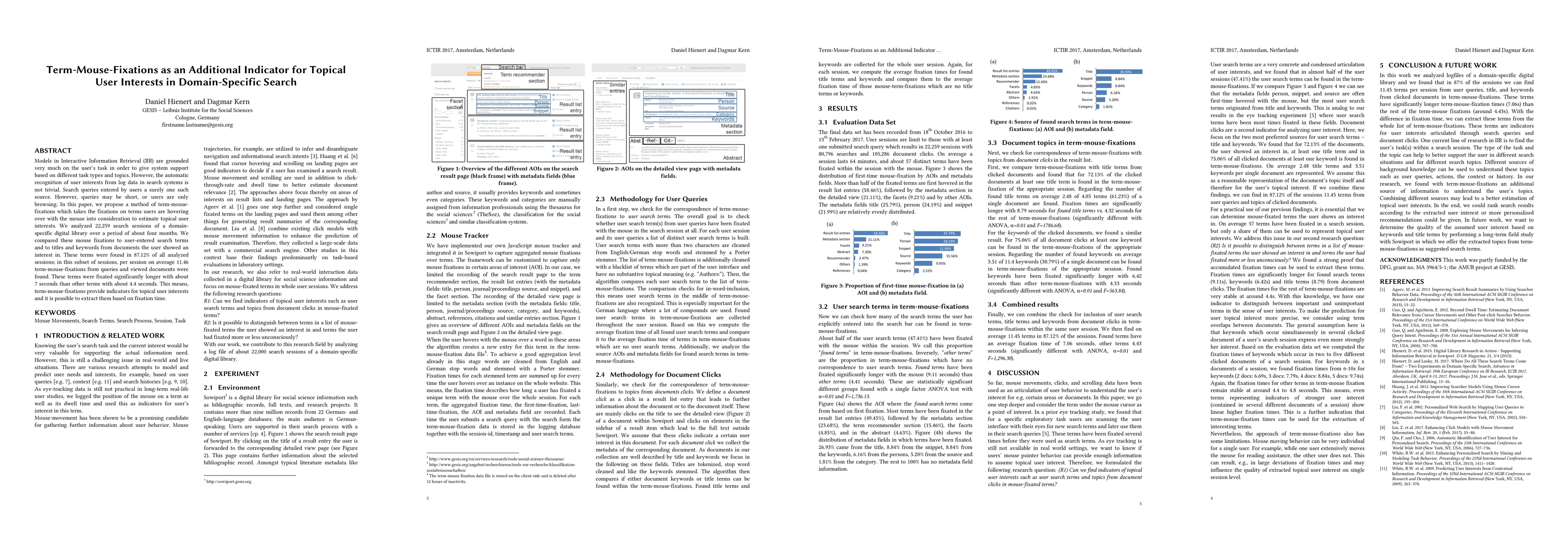 This paper proposes term-mouse-fixations as an indicator of topical user interests in domain-specific search, analyzing 22,259 sessions over four months. Term-mouse-fixations, where users hover over terms with the mouse, were found to indicate user interests better than search queries alone, with fixations lasting significantly longer (7 seconds vs. 4.4 seconds).