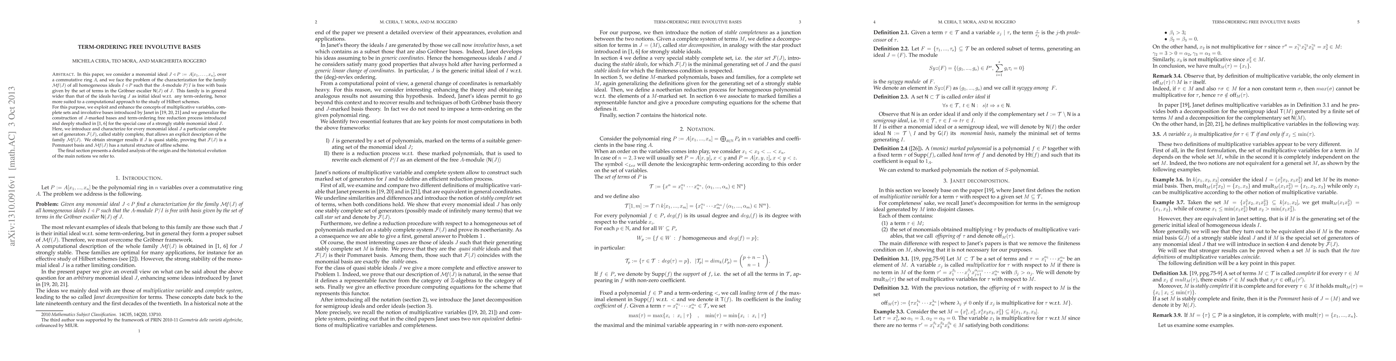 In this paper, we consider a monomial ideal J in P := A[x1,...,xn], over a commutative ring A, and we face the problem of the characterization for the family Mf(J) of all homogeneous ideals I in P such that the A-module P/I is free with basis given by the set of terms in the Groebner escalier N(J) of J. This family is in general wider than that of the ideals having J as initial ideal w.r.t. any term-ordering, hence more suited to a computational approach to the study of Hilbert schemes. For this purpose, we exploit and enhance the concepts of multiplicative variables, complete sets and involutive bases introduced by Janet and we generalize the construction of J-marked bases and term-ordering free reduction process introduced and deeply studied for the special case of a strongly stable monomial ideal J. Here, we introduce and characterize for every monomial ideal J a particular complete set of generators F(J), called stably complete, that allows an explicit description of the family Mf(J). We obtain stronger results if J is quasi stable, proving that F(J) is a Pommaret basis and Mf(J) has a natural structure of affine scheme. The final section presents a detailed analysis of the origin and the historical evolution of the main notions we refer to.