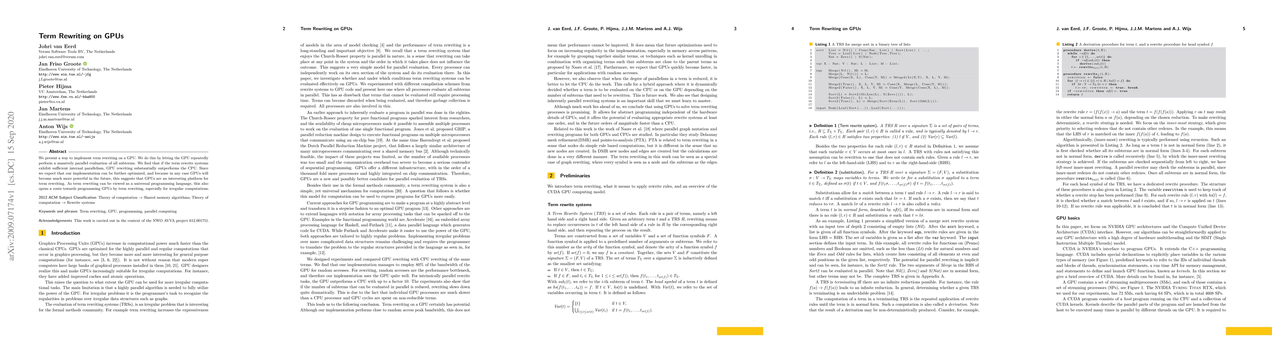 This paper explores implementing term rewriting on GPUs, leveraging parallel processing to outperform CPU-based methods. The study suggests that GPUs are promising for term rewriting due to their increasing power and potential for further optimization, which could enable programming GPUs via term rewriting for irregular computations.