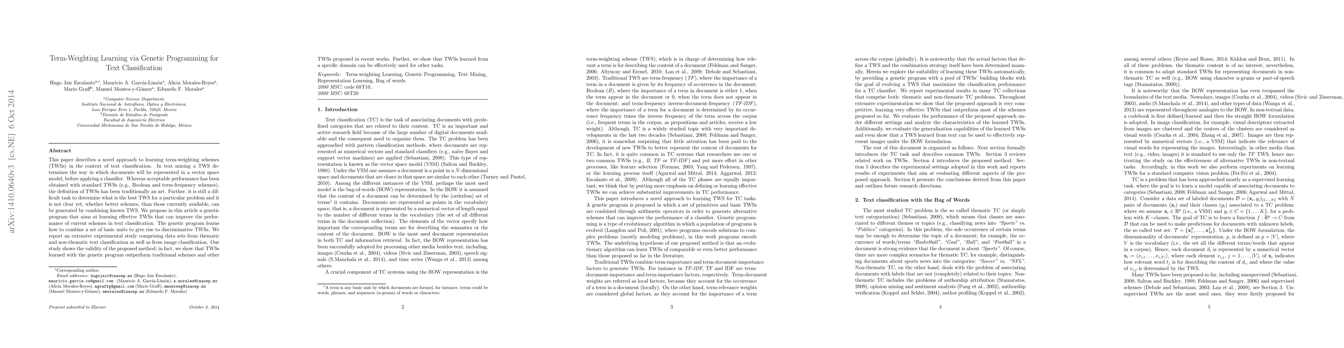 This paper proposes a genetic programming approach to learn effective term-weighting schemes (TWSs) for text classification, demonstrating that these learned TWSs outperform traditional and recent methods across various classification tasks. The study validates the method's effectiveness and transferability across different domains.