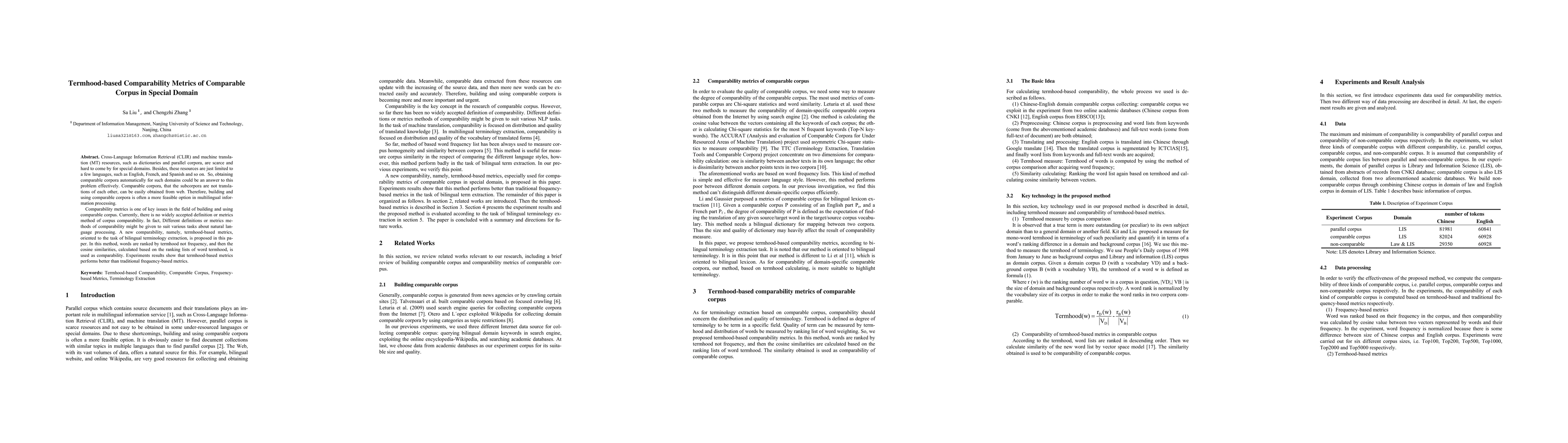 This paper proposes a termhood-based comparability metric for building multilingual comparable corpora in special domains where traditional resources are scarce. Unlike frequency-based metrics, termhood-based metrics rank words by their terminological relevance, showing better performance in bilingual terminology extraction compared to traditional methods.