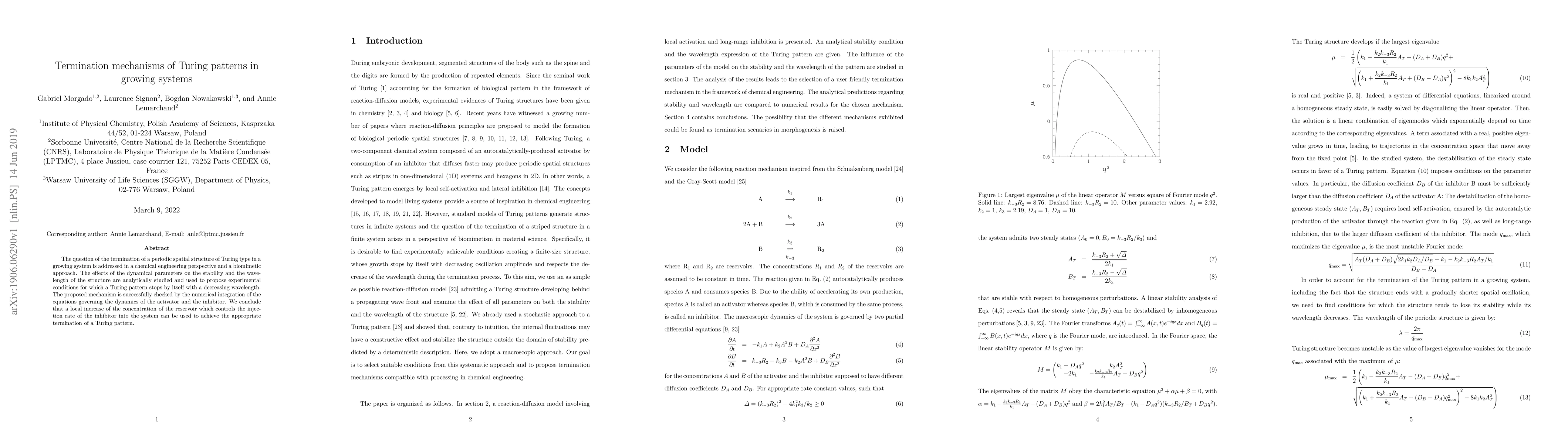 This paper explores the termination mechanisms of Turing patterns in growing systems, analytically studying the effects of dynamical parameters on pattern stability and wavelength. It proposes a mechanism where a local increase in the concentration of the reservoir controlling inhibitor injection can naturally halt the pattern, validated through numerical simulations.