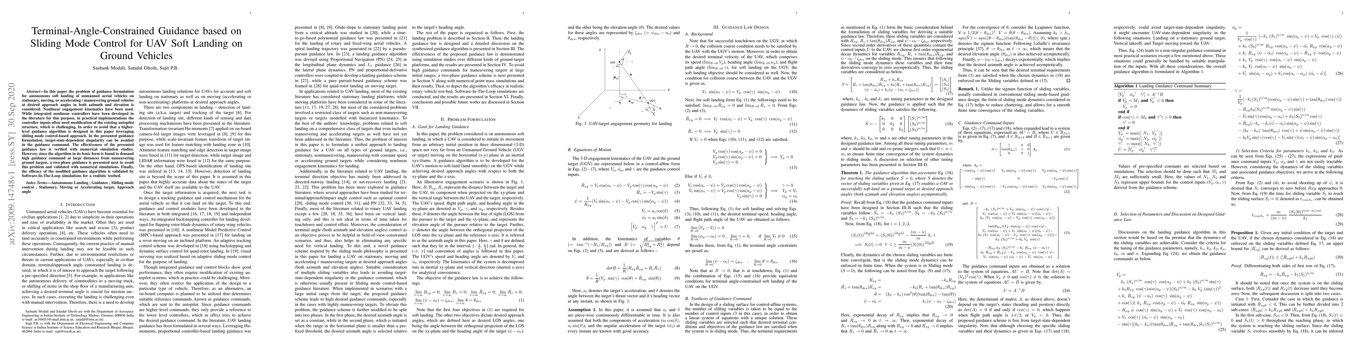 In this paper the problem of guidance formulation for autonomous soft landing of unmanned aerial vehicles on stationary, moving, or accelerating / maneuvering ground vehicles at desired approach angles in both azimuth and elevation is considered. Nonlinear engagement kinematics have been used. While integrated nonlinear controllers have been developed in the literature for this purpose, in practical implementations the controller inputs often need modification of the existing autopilot structure, which is challenging. In order to avoid that a higher-level guidance algorithm is designed in this paper leveraging sliding mode control-based approach. In the presented guidance formulation, target-state-dependent singularity can be avoided in the guidance command. The effectiveness of the presented guidance law is verified with numerical simulation studies. However, since the algorithm in its basic form is found to demand high guidance command at large distances from maneuvering ground targets, a two-phase guidance is presented next to avoid this problem and validated with numerical simulations. Finally, the efficacy of the modified guidance algorithm is validated by Software-In-The-Loop simulations for a realistic testbed.