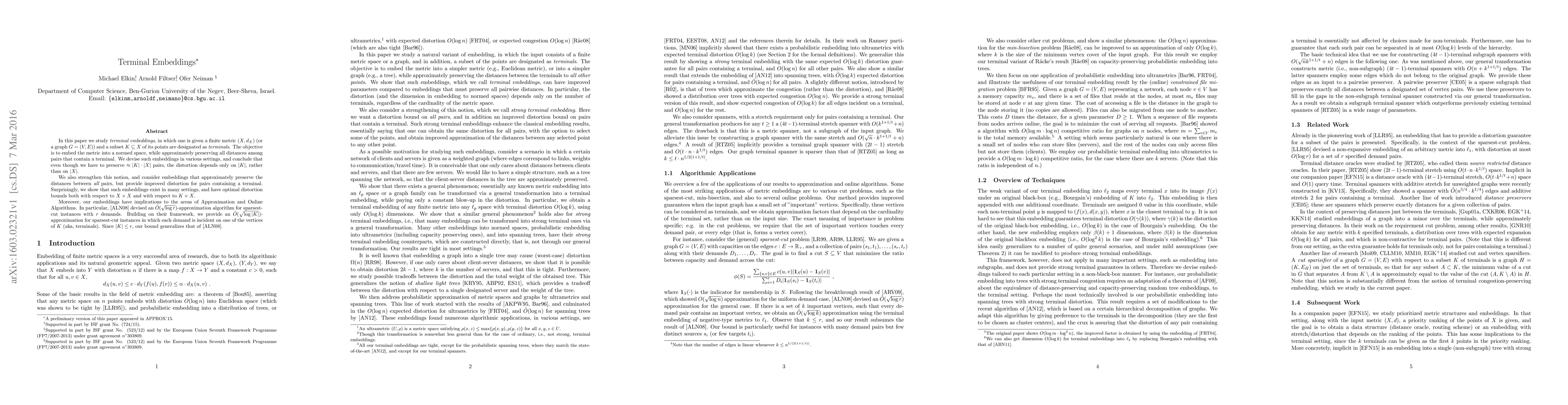 This paper explores terminal embeddings of finite metrics or graphs into normed spaces, focusing on the preservation of distances involving designated terminal points. It demonstrates that the distortion depends on the number of terminals rather than the total number of points, and presents improved embeddings that offer optimal distortion bounds for both all pairs and terminal-involved pairs. The research also extends to approximation algorithms for sparsest-cut problems, providing a generalized $\tilde{O}(\sqrt{\log |K|})$-approximation for instances with terminal demands.