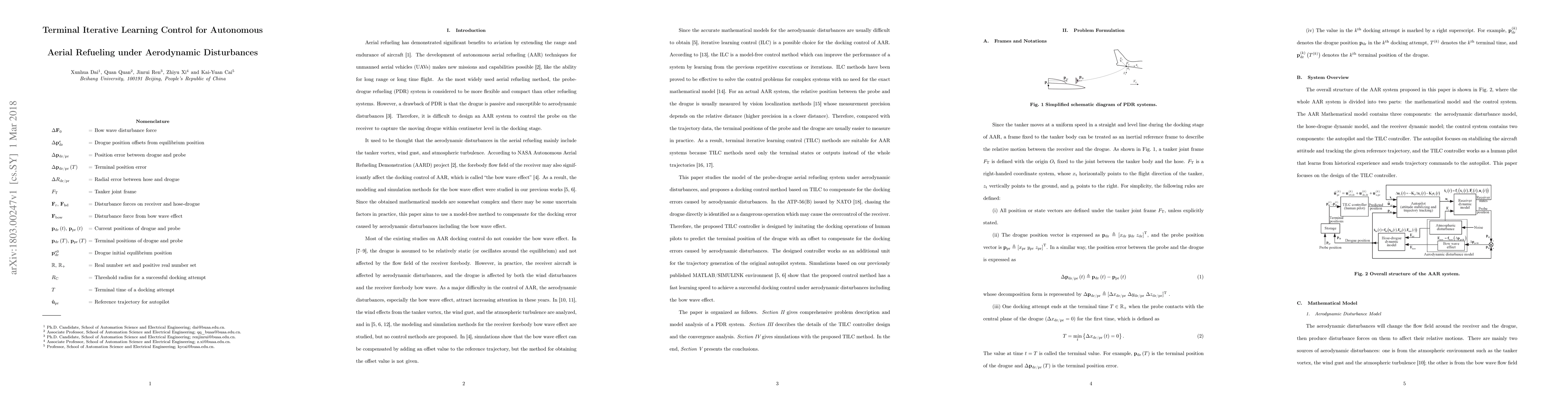 This paper proposes a terminal iterative learning control method for autonomous aerial refueling under aerodynamic disturbances, achieving successful docking by compensating for errors. Simulation results show the method's fast learning speed and effectiveness against disturbances like the bow wave effect.