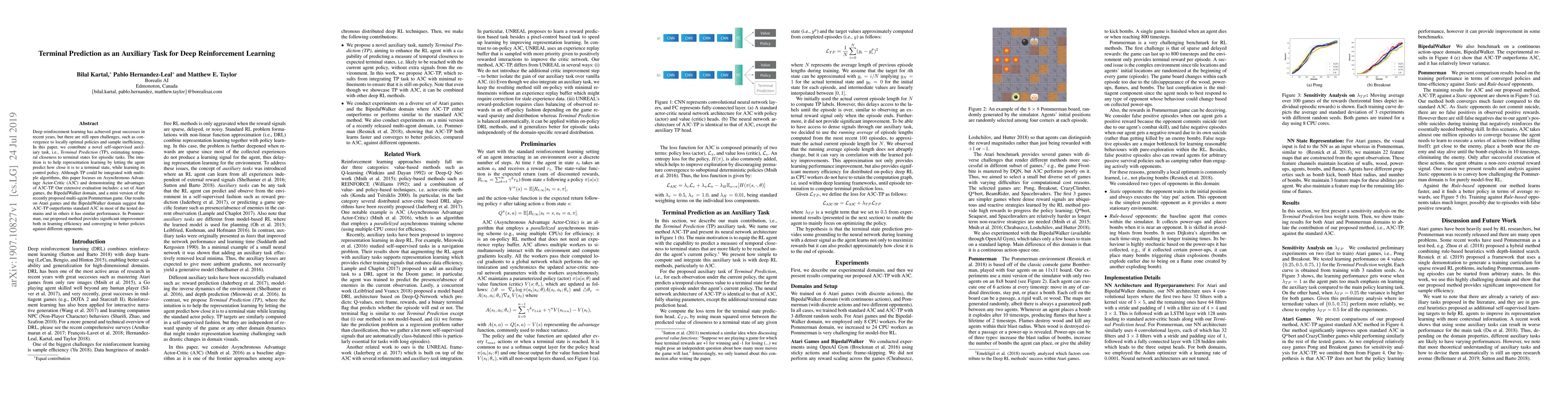 This paper introduces Terminal Prediction as a self-supervised auxiliary task to enhance deep reinforcement learning, specifically focusing on A3C. The method helps representation learning by guiding the agent to estimate its proximity to terminal states, leading to improved performance and convergence in various domains including Atari games and BipedalWalker.