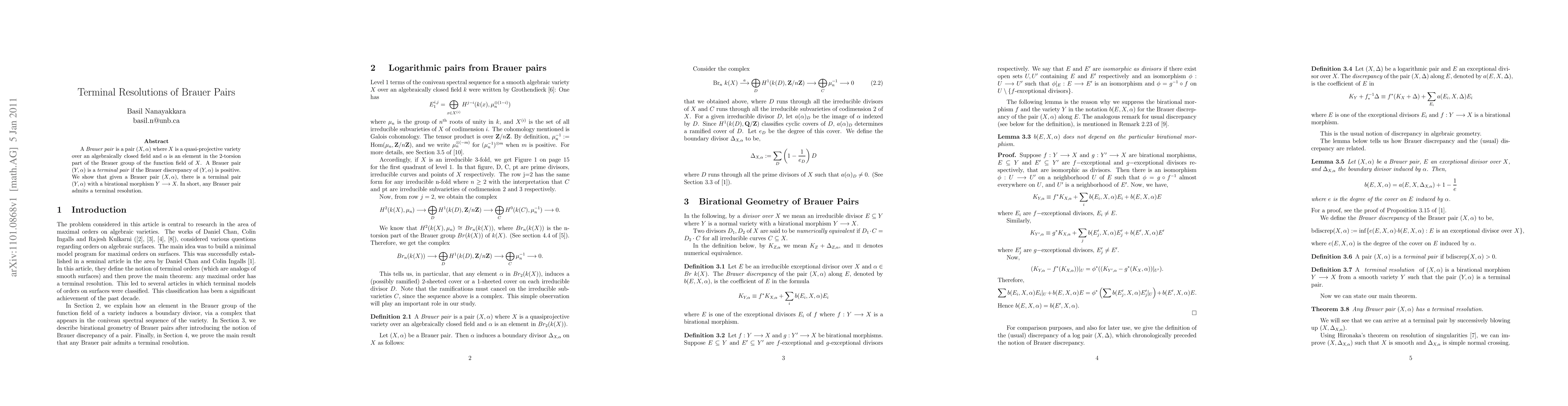 A Brauer pair is a pair (X, {\alpha}) where X is a quasi-projective variety over an algebraically closed field and {\alpha} is an element in the 2-torsion part of the Brauer group of the function field of X. A Brauer pair (Y, {\alpha}) is a terminal pair if the Brauer discrepancy of (Y, {\alpha}) is positive. We show that given a Brauer pair (X, {\alpha}), there is a terminal pair (Y, {\alpha}) with a birational morphism Y -> X. In short, any Brauer pair admits a terminal resolution.
