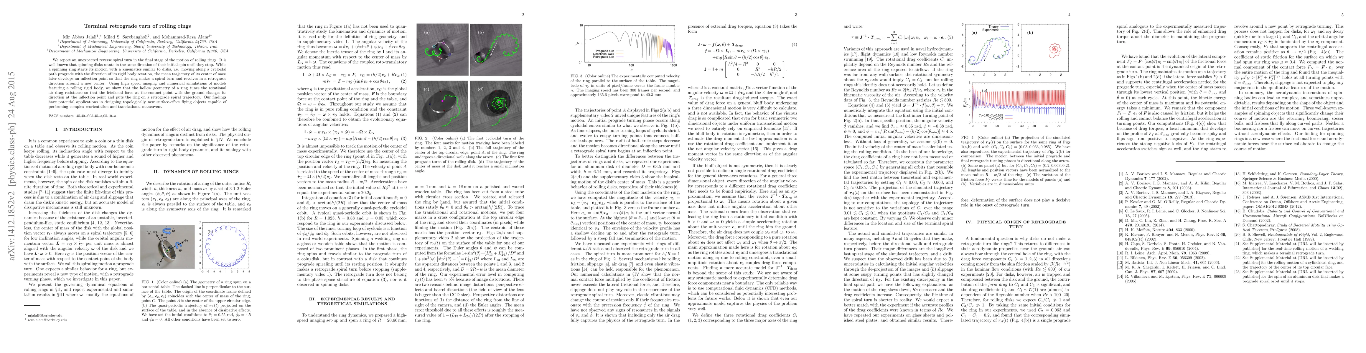 We report an unexpected reverse spiral turn in the final stage of the motion of rolling rings. It is well known that spinning disks rotate in the same direction of their initial spin until they stop. While a spinning ring starts its motion with a kinematics similar to disks, i.e. moving along a cycloidal path prograde with the direction of its rigid body rotation, the mean trajectory of its center of mass later develops an inflection point so that the ring makes a spiral turn and revolves in a retrograde direction around a new center. Using high speed imaging and numerical simulations of models featuring a rolling rigid body, we show that the hollow geometry of a ring tunes the rotational air drag resistance so that the frictional force at the contact point with the ground changes its direction at the inflection point and puts the ring on a retrograde spiral trajectory. Our findings have potential applications in designing topologically new surface-effect flying objects capable of performing complex reorientation and translational maneuvers.