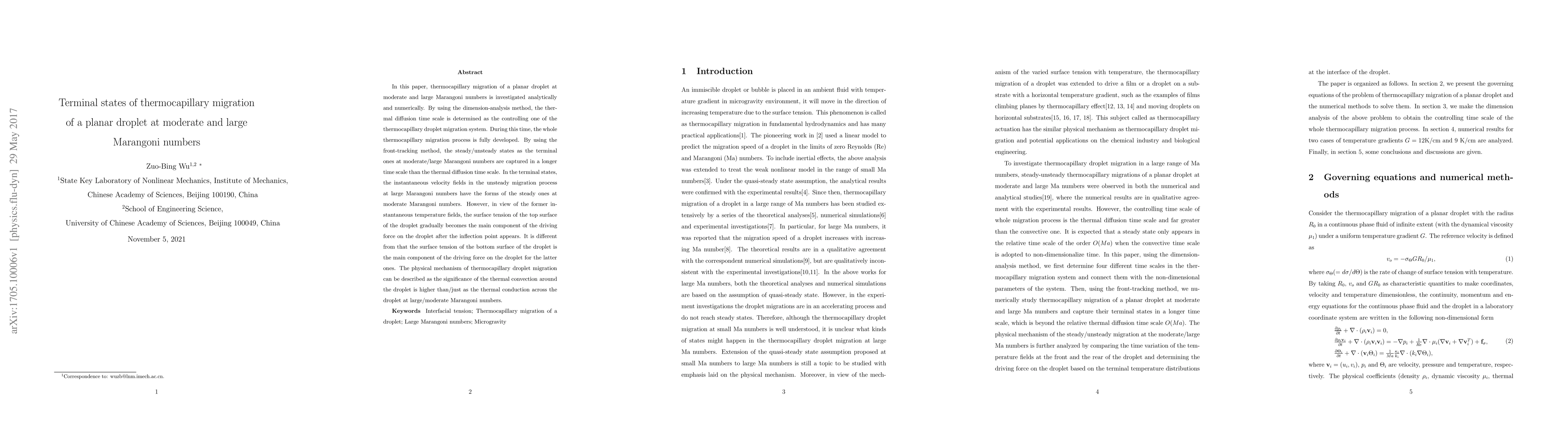 In this paper, thermocapillary migration of a planar droplet at moderate and large Marangoni numbers is investigated analytically and numerically. By using the dimension-analysis method, the thermal diffusion time scale is determined as the controlling one of the thermocapillary droplet migration system. During this time, the whole thermocapillary migration process is fully developed. By using the front-tracking method, the steady/unsteady states as the terminal ones at moderate/large Marangoni numbers are captured in a longer time scale than the thermal diffusion time scale. In the terminal states, the instantaneous velocity fields in the unsteady migration process at large Marangoni numbers have the forms of the steady ones at moderate Marangoni numbers. However, in view of the former instantaneous temperature fields, the surface tension of the top surface of the droplet gradually becomes the main component of the driving force on the droplet after the inflection point appears. It is different from that the surface tension of the bottom surface of the droplet is the main component of the driving force on the droplet for the latter ones. The physical mechanism of thermocapillary droplet migration can be described as the significance of the thermal convection around the droplet is higher than/just as the thermal conduction across the droplet at large/moderate Marangoni numbers.