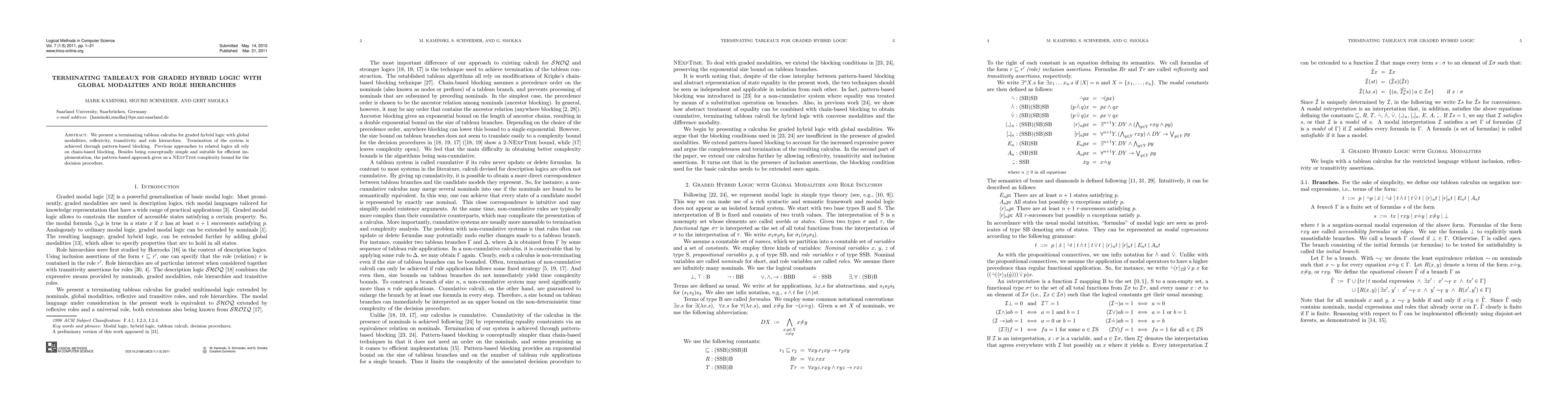 We present a terminating tableau calculus for graded hybrid logic with global modalities, reflexivity, transitivity and role hierarchies. Termination of the system is achieved through pattern-based blocking. Previous approaches to related logics all rely on chain-based blocking. Besides being conceptually simple and suitable for efficient implementation, the pattern-based approach gives us a NExpTime complexity bound for the decision procedure.