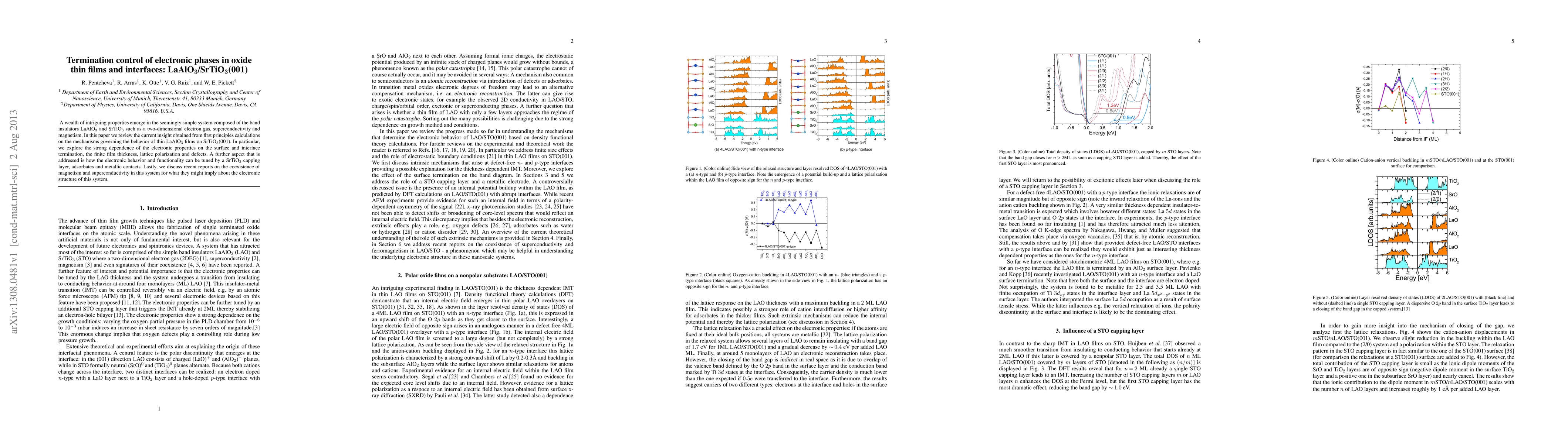 This paper reviews first-principles calculations on the electronic properties of LaAlO3 films on SrTiO3(001), focusing on the effects of surface and interface termination, film thickness, and lattice polarization. It also explores how SrTiO3 capping layers, adsorbates, and metallic contacts can control electronic behavior and the potential coexistence of magnetism and superconductivity.