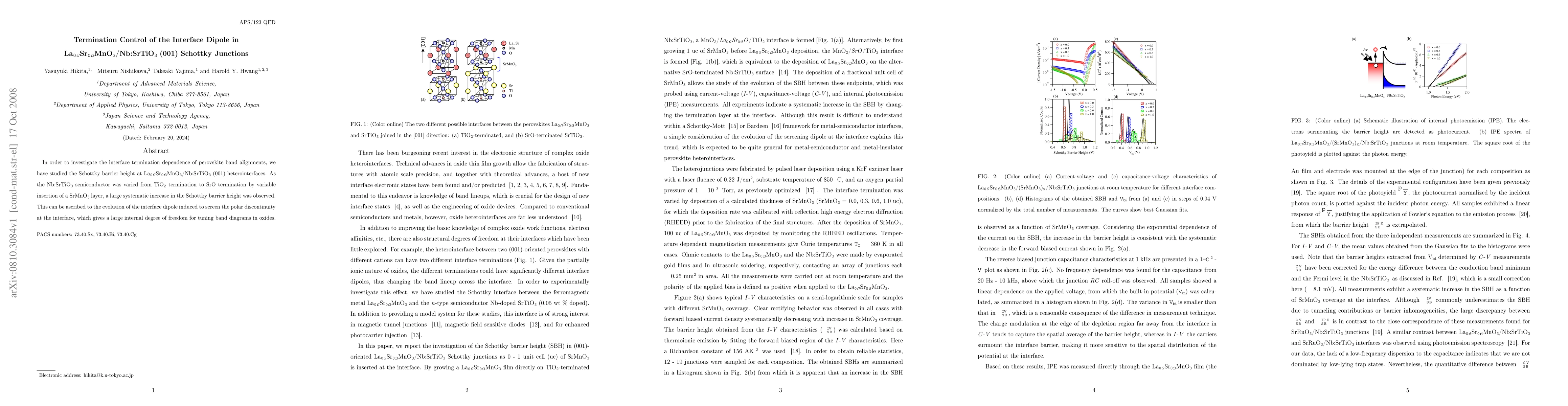 In order to investigate the interface termination dependence of perovskite band alignments, we have studied the Schottky barrier height at La$_{0.7}$Sr$_{0.3}$MnO$_3$/Nb:SrTiO$_3$ (001) heterointerfaces. As the Nb:SrTiO$_3$ semiconductor was varied from TiO$_2$ termination to SrO termination by variable insertion of a SrMnO$_3$ layer, a large systematic increase in the Schottky barrier height was observed. This can be ascribed to the evolution of the interface dipole induced to screen the polar discontinuity at the interface, which gives a large internal degree of freedom for tuning band diagrams in oxides.