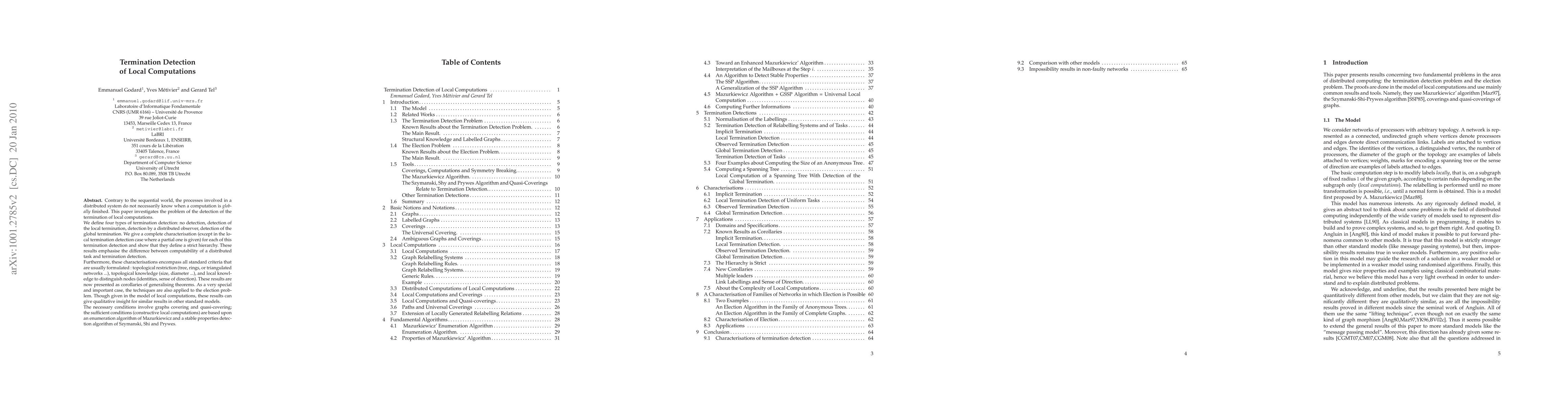 Contrary to the sequential world, the processes involved in a distributed system do not necessarily know when a computation is globally finished. This paper investigates the problem of the detection of the termination of local computations. We define four types of termination detection: no detection, detection of the local termination, detection by a distributed observer, detection of the global termination. We give a complete characterisation (except in the local termination detection case where a partial one is given) for each of this termination detection and show that they define a strict hierarchy. These results emphasise the difference between computability of a distributed task and termination detection. Furthermore, these characterisations encompass all standard criteria that are usually formulated : topological restriction (tree, rings, or triangu- lated networks ...), topological knowledge (size, diameter ...), and local knowledge to distinguish nodes (identities, sense of direction). These results are now presented as corollaries of generalising theorems. As a very special and important case, the techniques are also applied to the election problem. Though given in the model of local computations, these results can give qualitative insight for similar results in other standard models. The necessary conditions involve graphs covering and quasi-covering; the sufficient conditions (constructive local computations) are based upon an enumeration algorithm of Mazurkiewicz and a stable properties detection algorithm of Szymanski, Shi and Prywes.