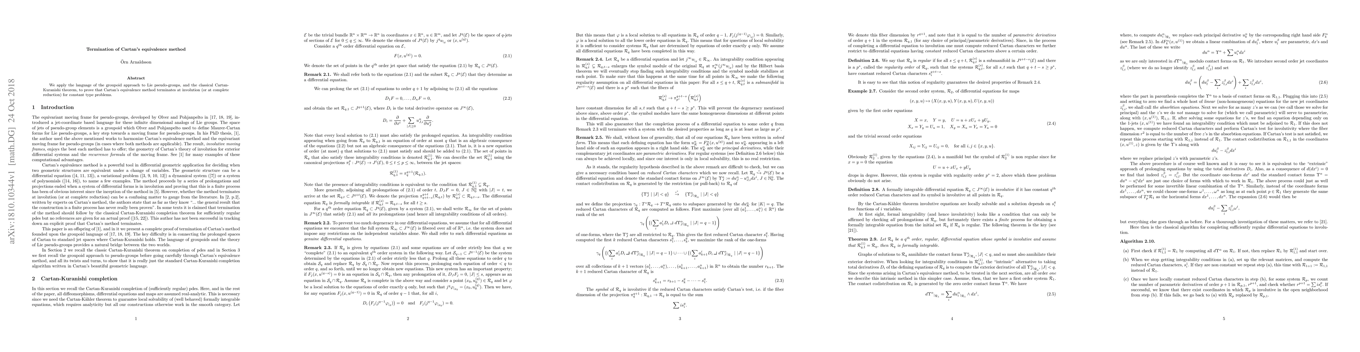 Summary: The paper utilizes the groupoid approach to Lie pseudo-groups and the Cartan-Kuranishi theorem to demonstrate that Cartan's equivalence method ends at involution for constant type problems, ensuring complete reduction.