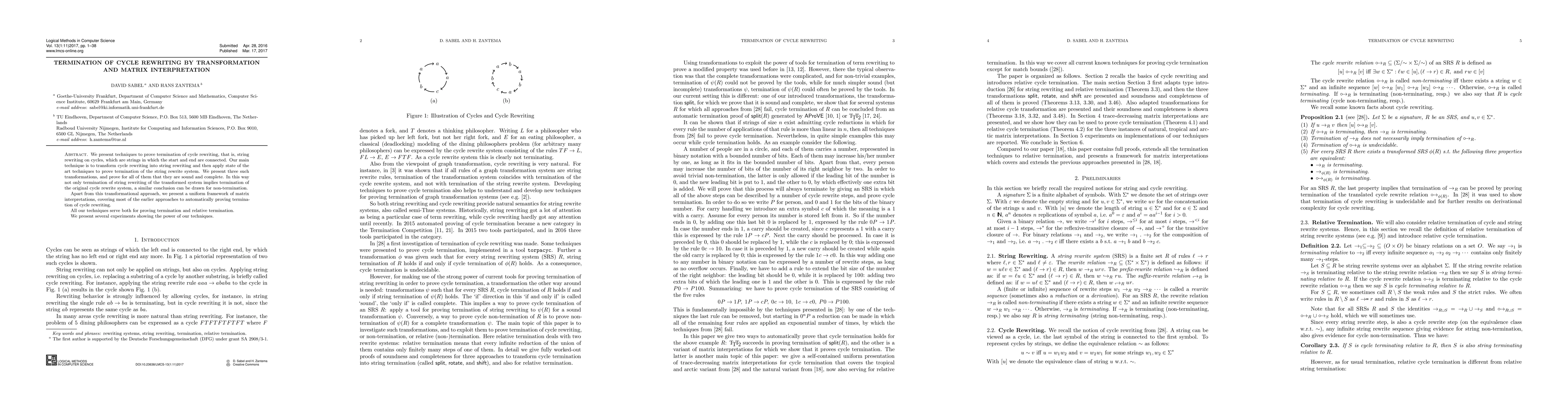 This paper presents techniques to prove termination of cycle rewriting, transforming it into string rewriting for analysis, and introduces a matrix interpretation framework. The transformations are shown to be sound and complete, ensuring both termination and non-termination conclusions for the original system.