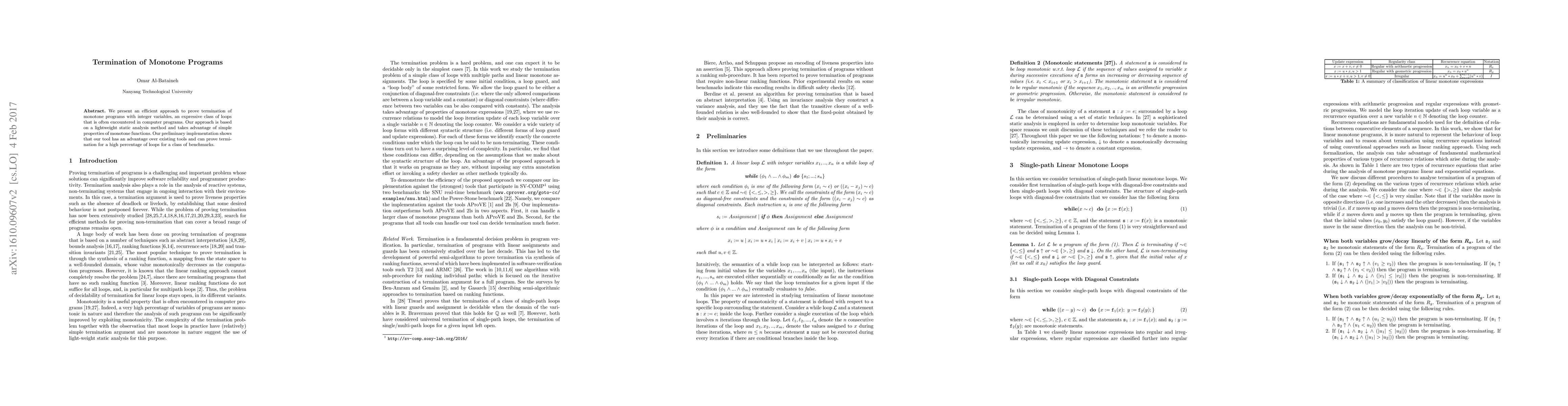 This paper presents a lightweight approach to prove termination of monotone programs with integer variables, offering an efficient solution for a common class of loops in computer programs.